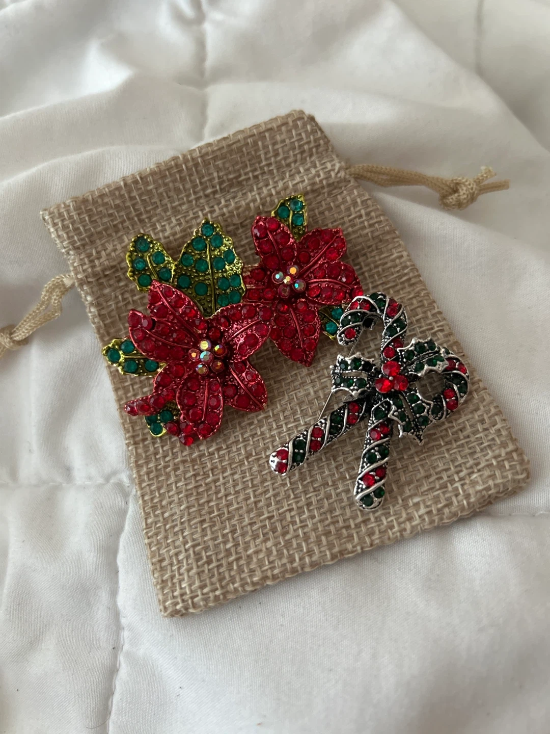 89Add some holiday sparkle with these adorable brooches! You'll get two festive designs: a red and green poinsettia and a candy cane. Perfect for pinning on your coat, scarf, or sweater to spread some Christmas cheer New and gorgeous Pick up 1 min away from king George Skytrain station or can mail if needed Please respect pricing God bless!