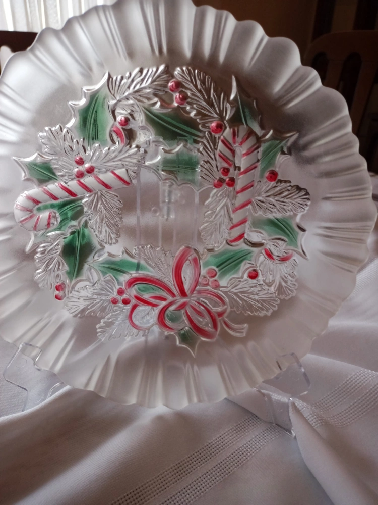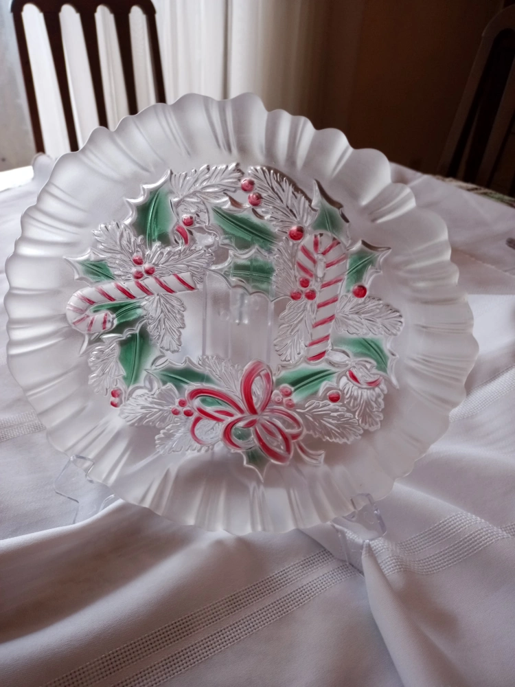 89Selling a lovely vintage Christmas frosted glass plate. It features a festive design with holly, candy canes, and berries. Perfect for adding a touch of holiday cheer to your home!