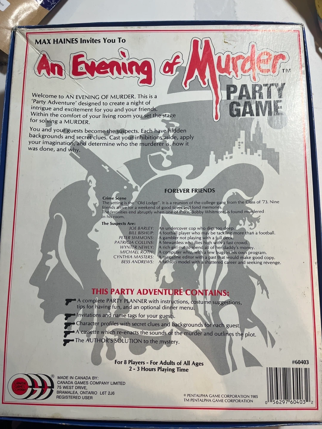 Host a murder mystery in your home and invite your friends to become the suspects for an evening of mystery and intrigue with this party game! Perfect for 8 players of all ages and about 2-3 hours of playing time