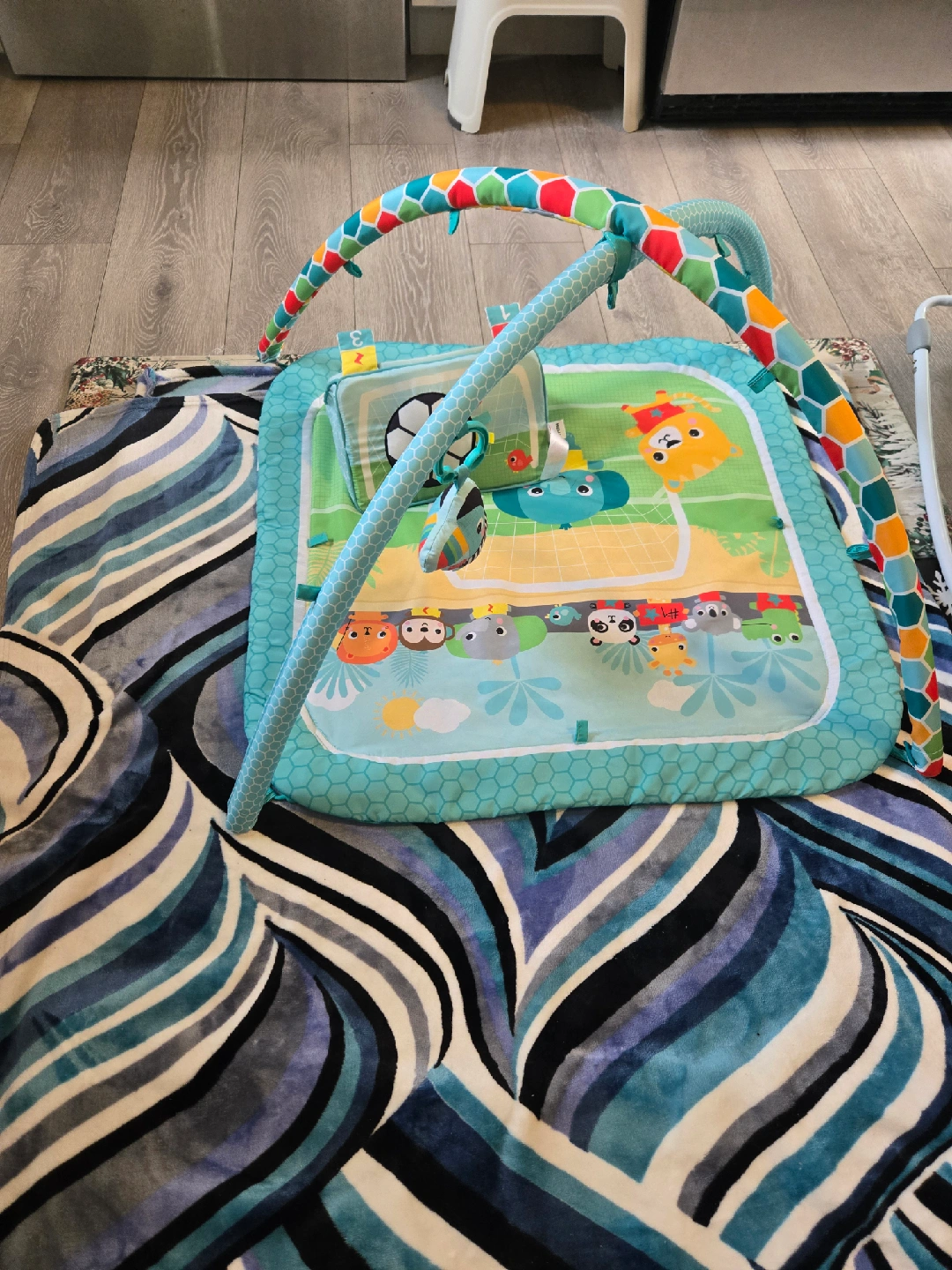 Selling a baby play gym. It's in great condition and ready for a new little one to enjoy! It features colourful hanging toys and a soft mat for baby to play on. Perfect for tummy time and early development. selling as i need more space in room and my twins started crawling so they do not use it anymore.