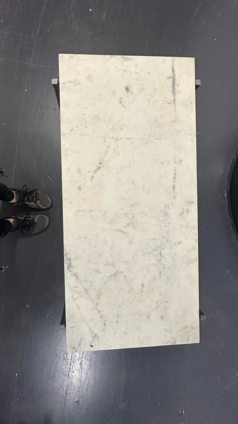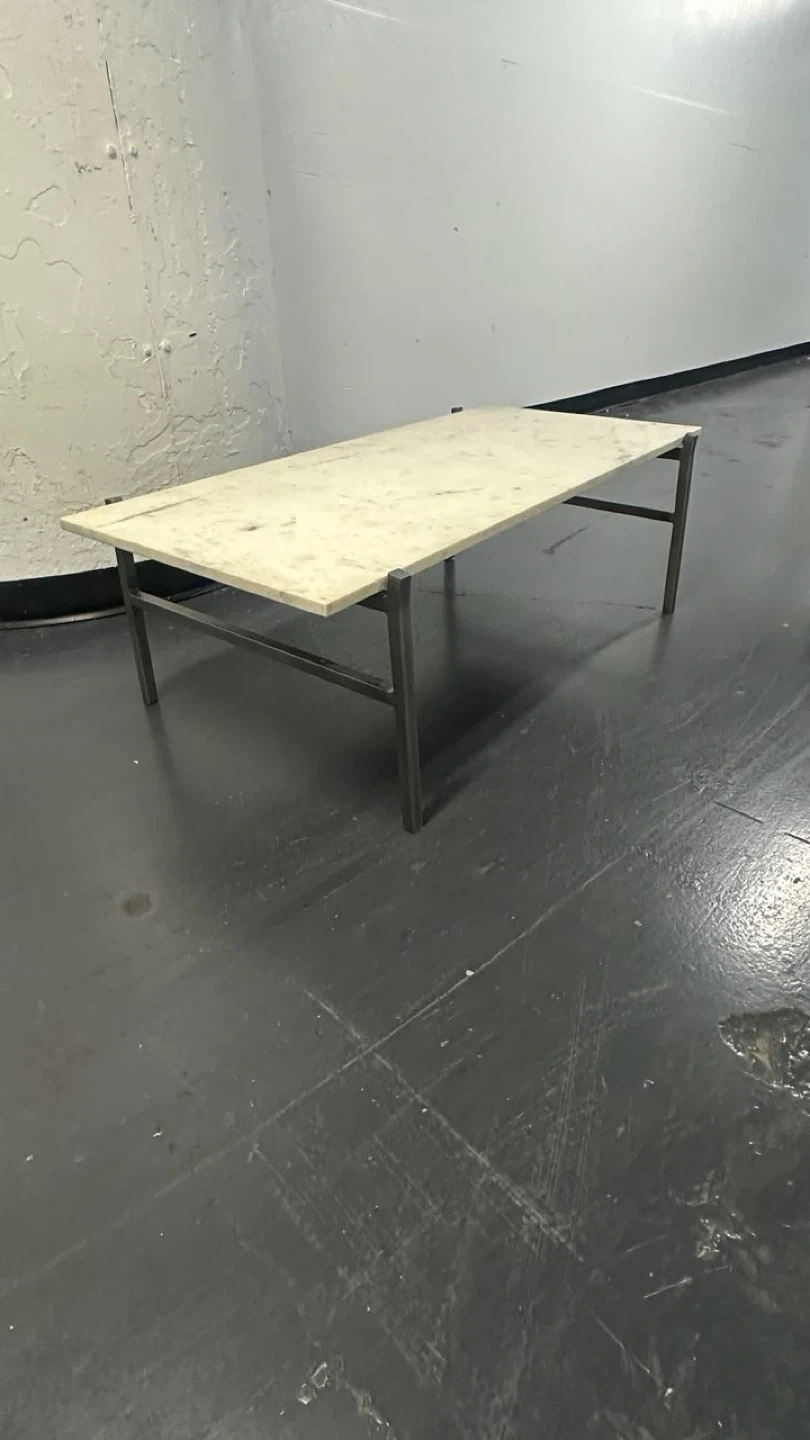 Selling a marble coffee table. It has a rectangular white marble top and a dark metal base. It's a stylish piece that would look great in any living room