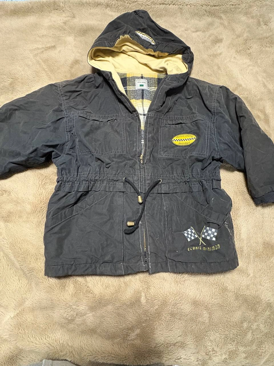 93Here's a cute Benetton kids' hooded jacket! It features a black exterior with a yellow interior lining. There are some racing-themed details, like checkered flags and a racing stripe design on the front size:AGE 6