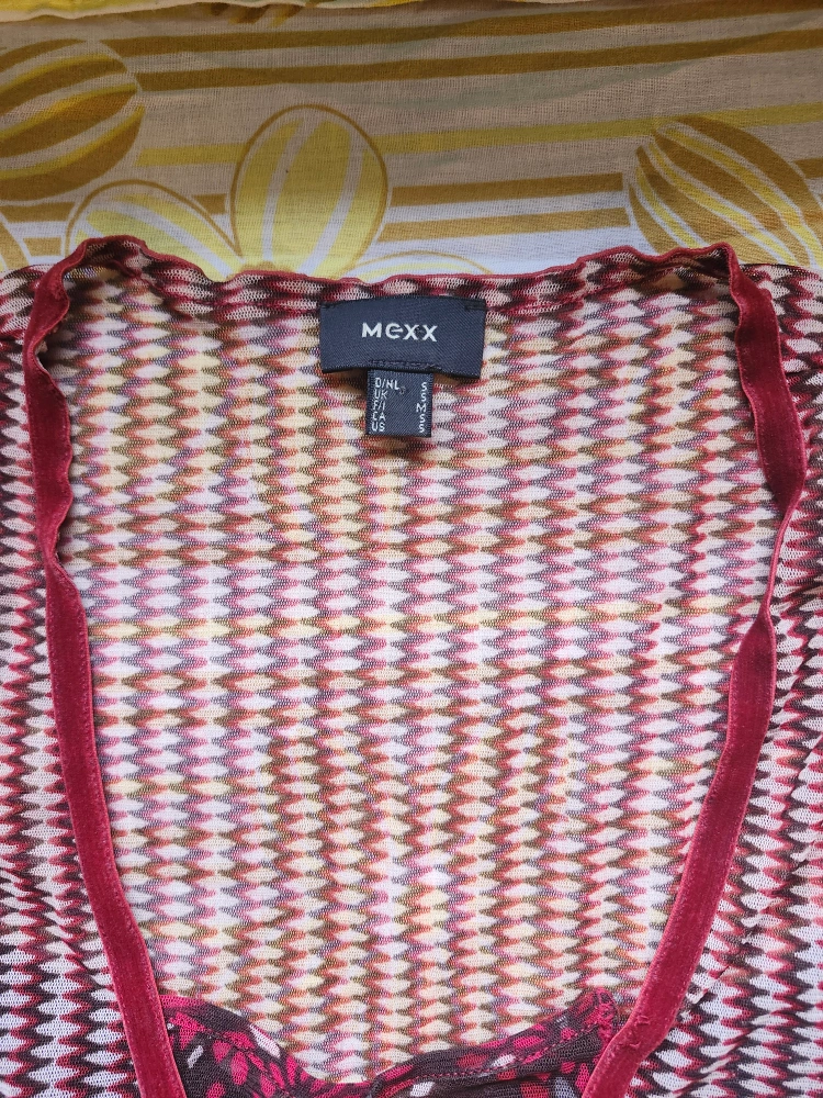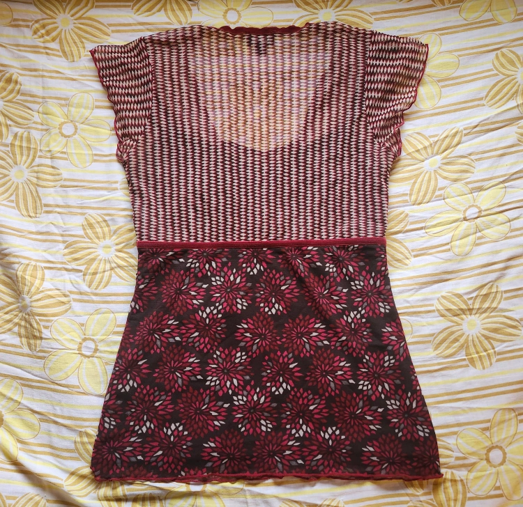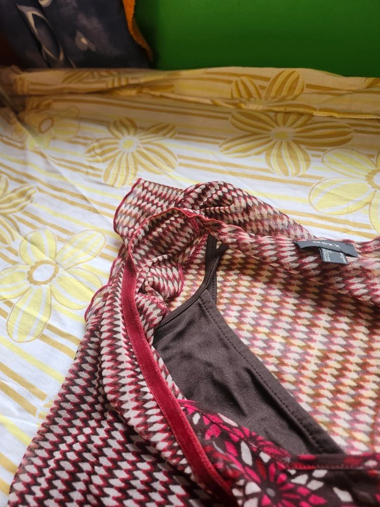 late 2000s red and brown sheer patterned babydoll top, by the brand Mexx