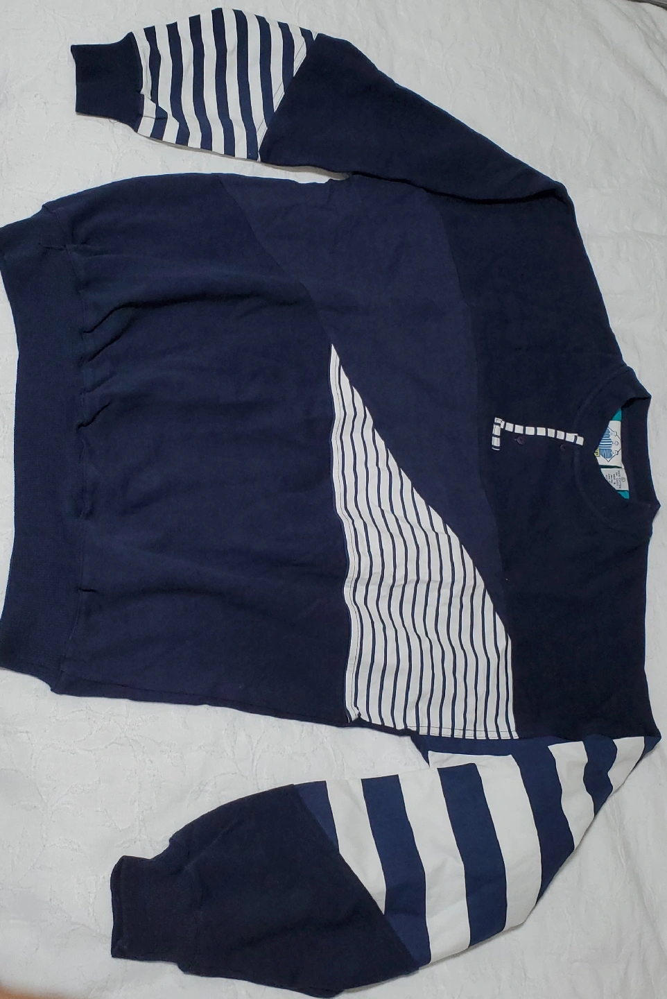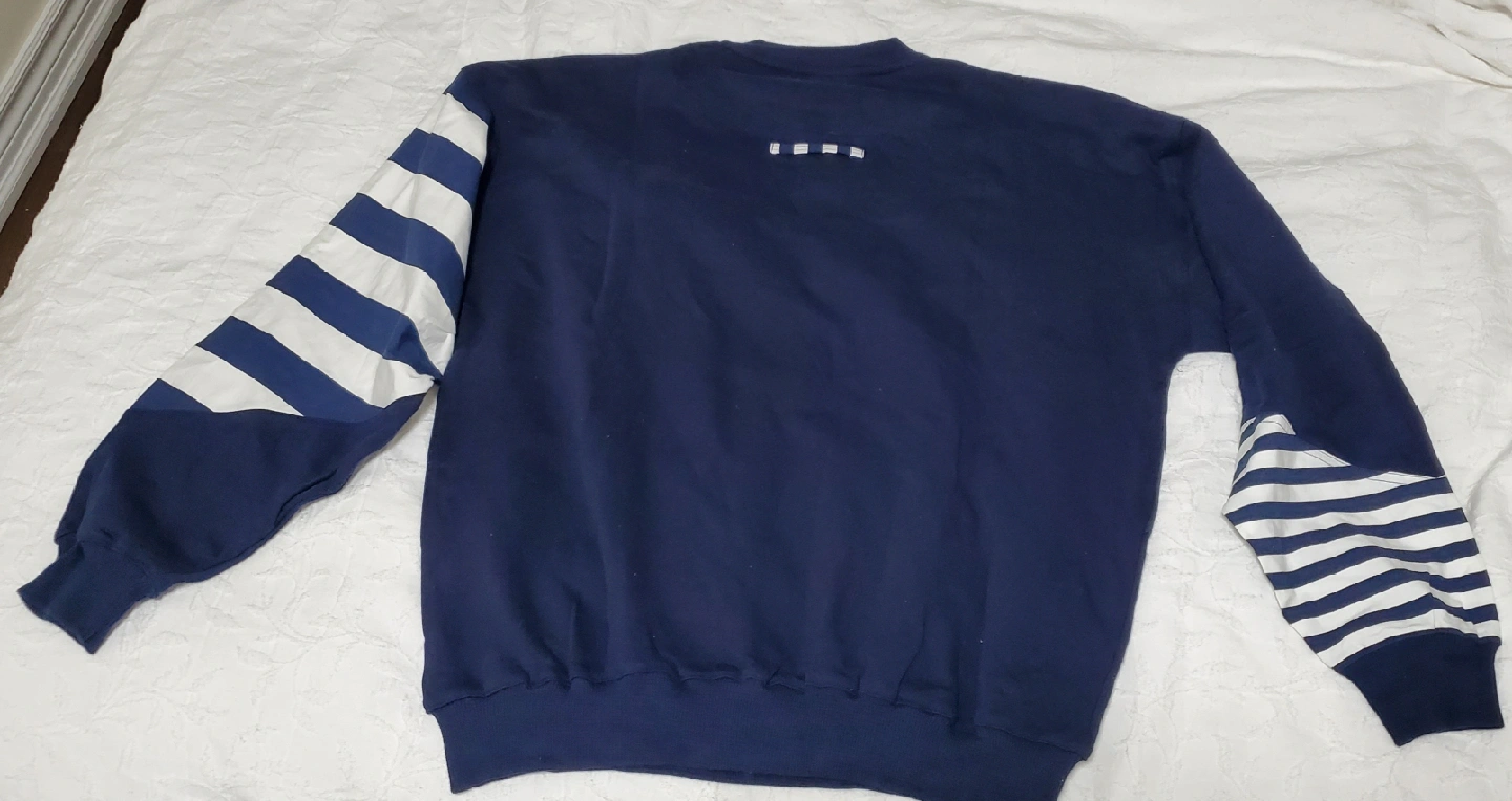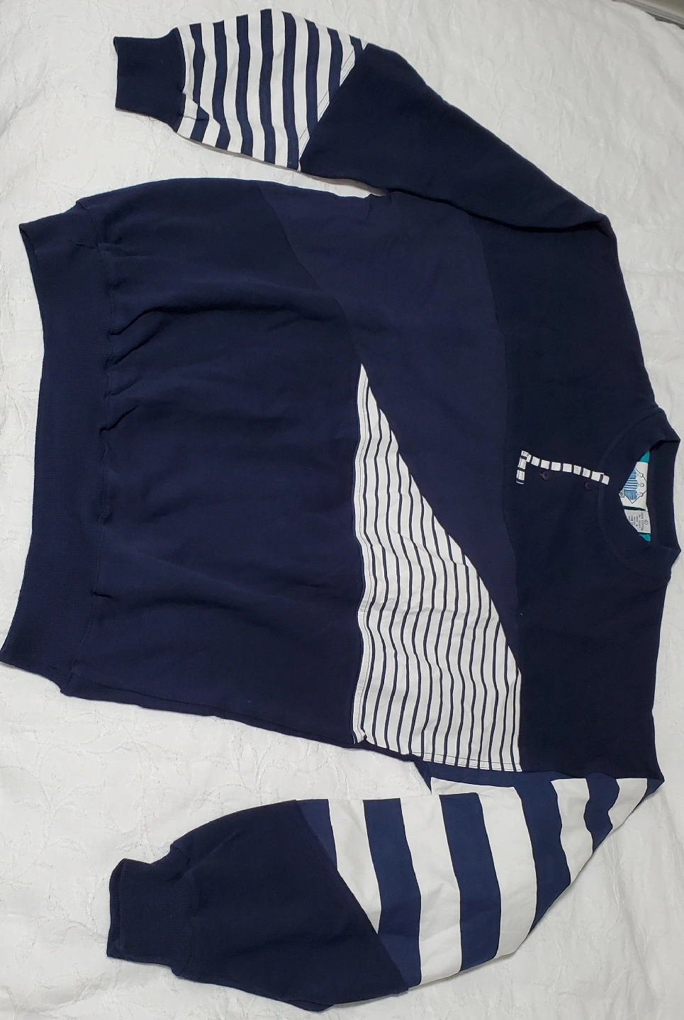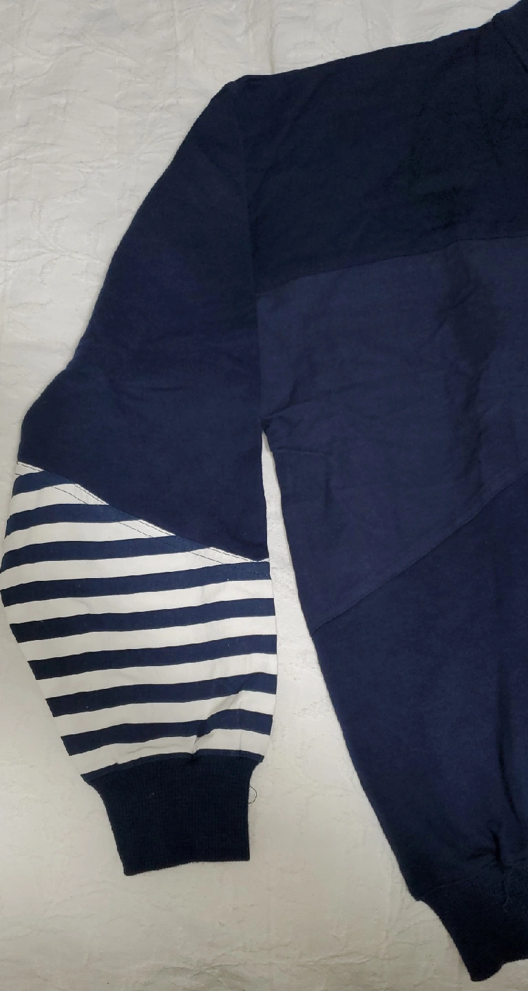 22LINE-UP Navy blue sweatshirt with white stripes! It's a size -L and in great condition. The design features a unique patchwork style with stripes on the sleeves and a small detail on the chest. Perfect for a casual, comfy look!