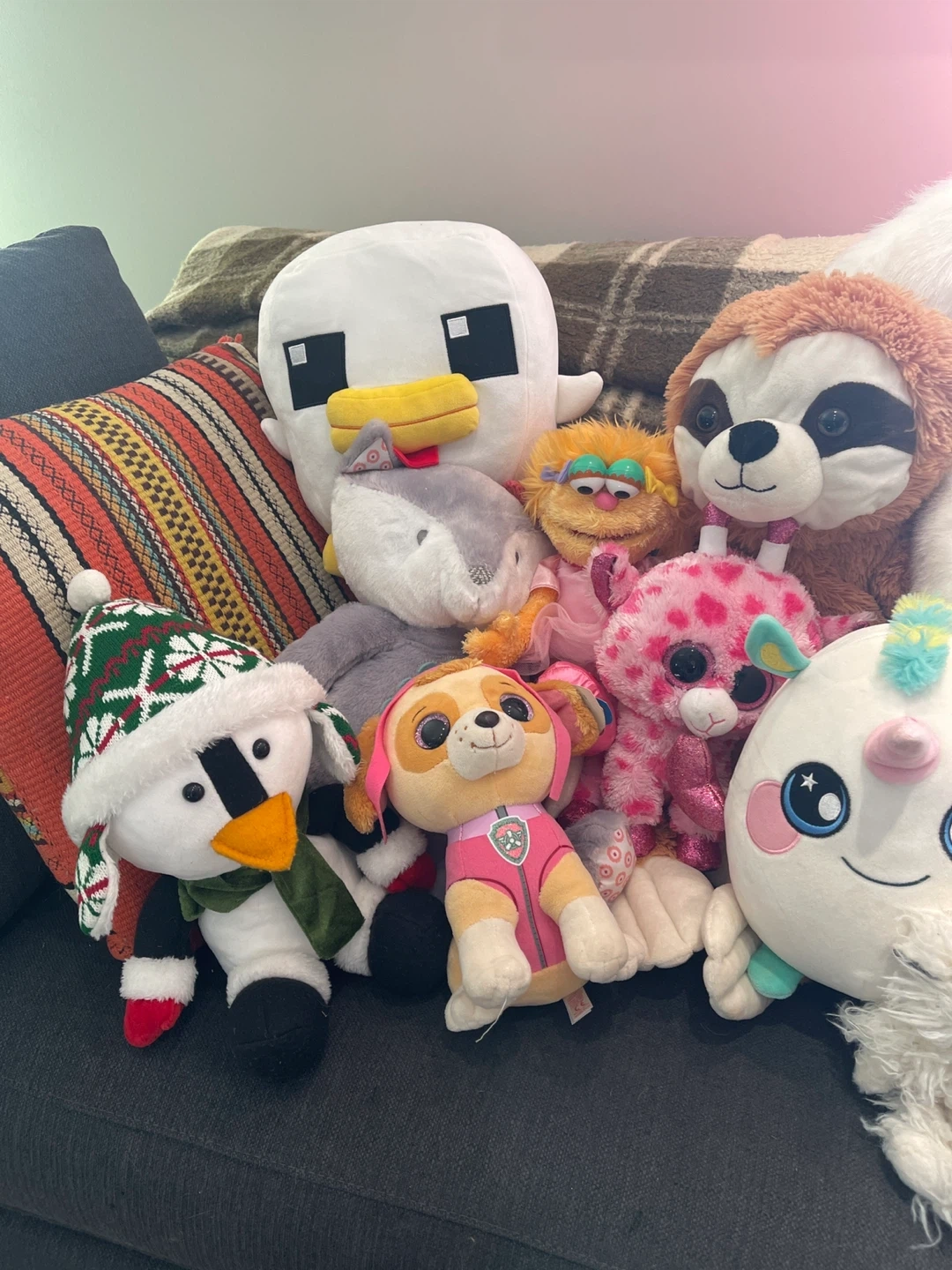 A collection of 14 assorted plush toys, including a Minecraft duck, a sloth, a white bunny, a blue llama, a Sally plush, a penguin, a unicorn, Beanie Boo Paw Patrol Sky puppy, lamb, fox, pink giraffe, muppet, plush butterfly. All in good clean condition, pet free, smoke free house. 50$ for all, or 10$ each.
