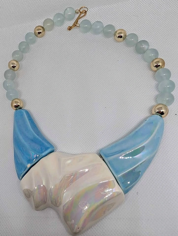 Large clunky statement piece iridescent blue and cream glazed ceramic with unusual pale blue and gold beads. tiny chip on front blue part visible in photo not noticeable otherwise.