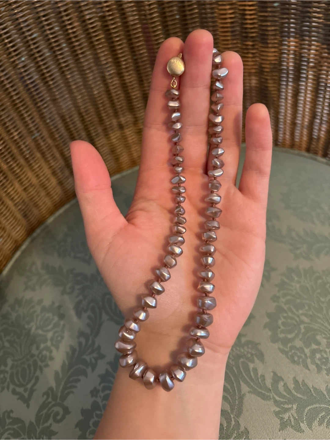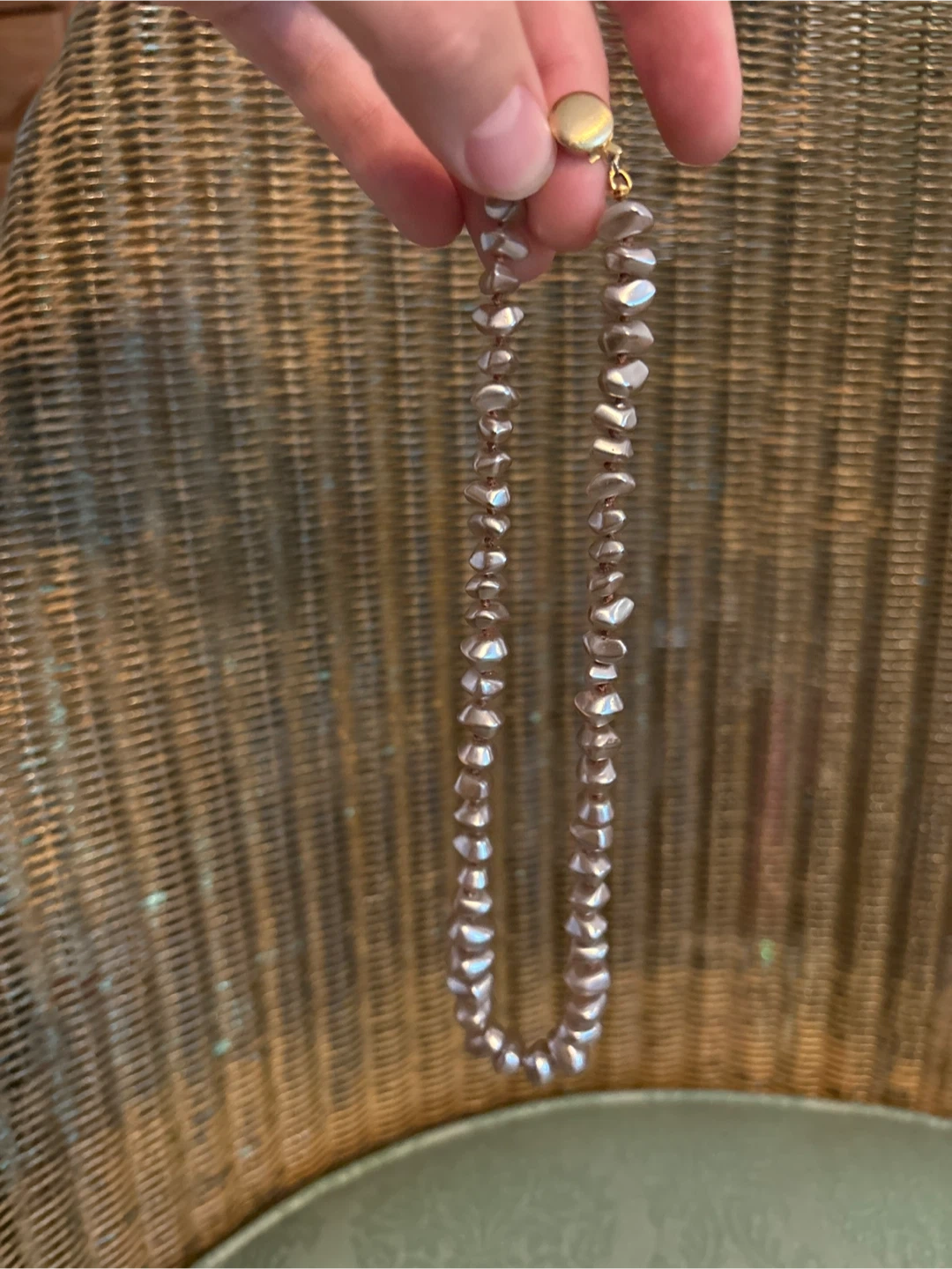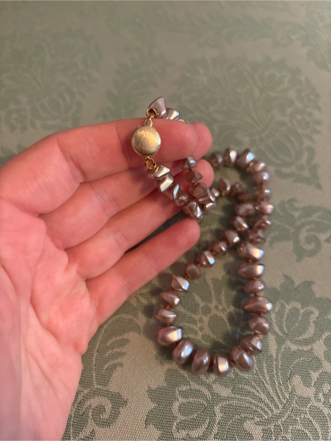 15A beautiful faux pearl beaded necklace. It's in great condition and ready to add a touch of elegance to any outfit. The beads are a soft dusty rose colour with knots tied in between each. It’s a choker style and has lovely slide and clip clasp.