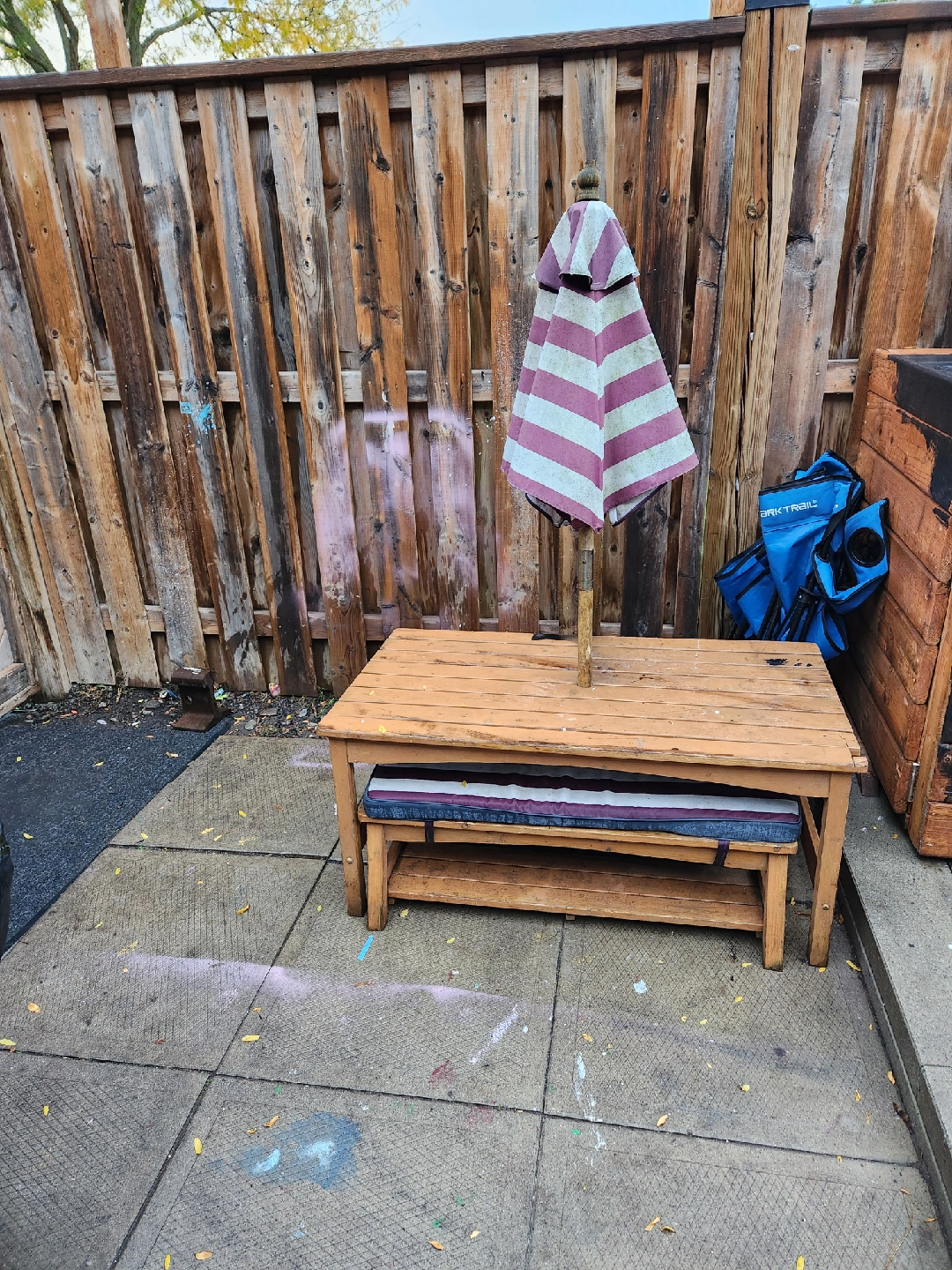 10Selling a wooden outdoor table with an attached bench. It also comes with a striped cushion for the bench. Perfect for a small patio or garden area! The table has a hole for an umbrella.