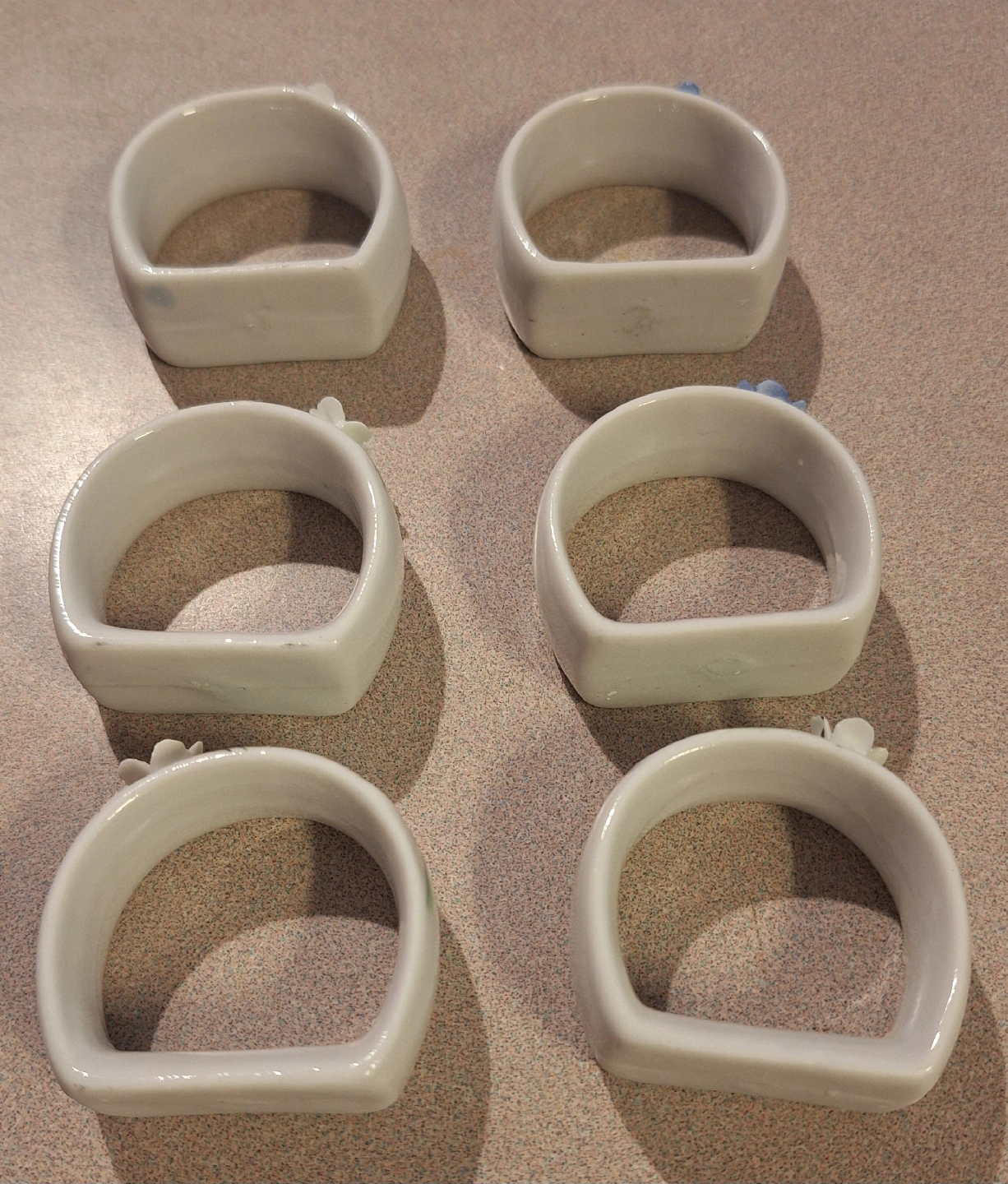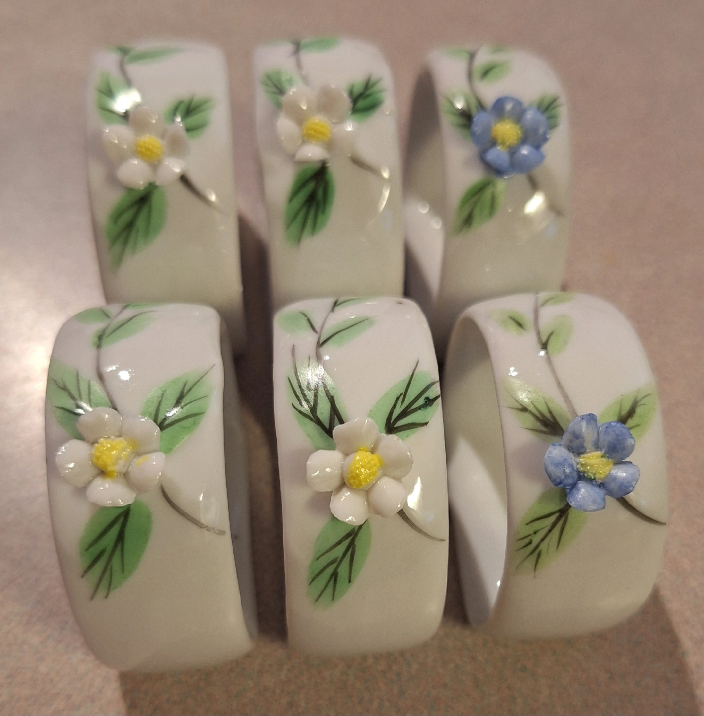 71Selling a set of six vintage porcelain napkin rings. They feature a delicate floral design with green leaves and small white and blue flowers. Comes with the original box!