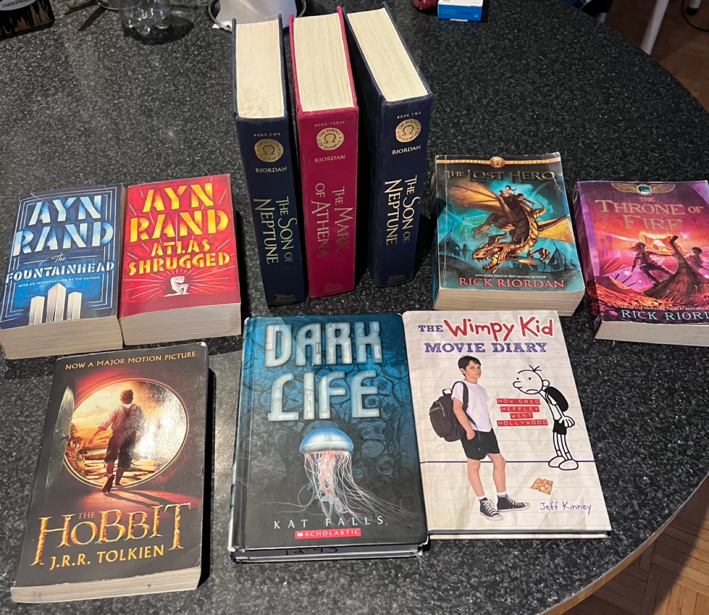 collection of books including titles by Rick Riordan (The Son of Neptune, The Mark of Athena, The Lost Hero, The Throne of Fire), Ayn Rand (The Fountainhead, Atlas Shrugged), The Wimpy Kid Movie Diary by Jeff Kinney, and The Hobbit by J.R.R. Tolkien