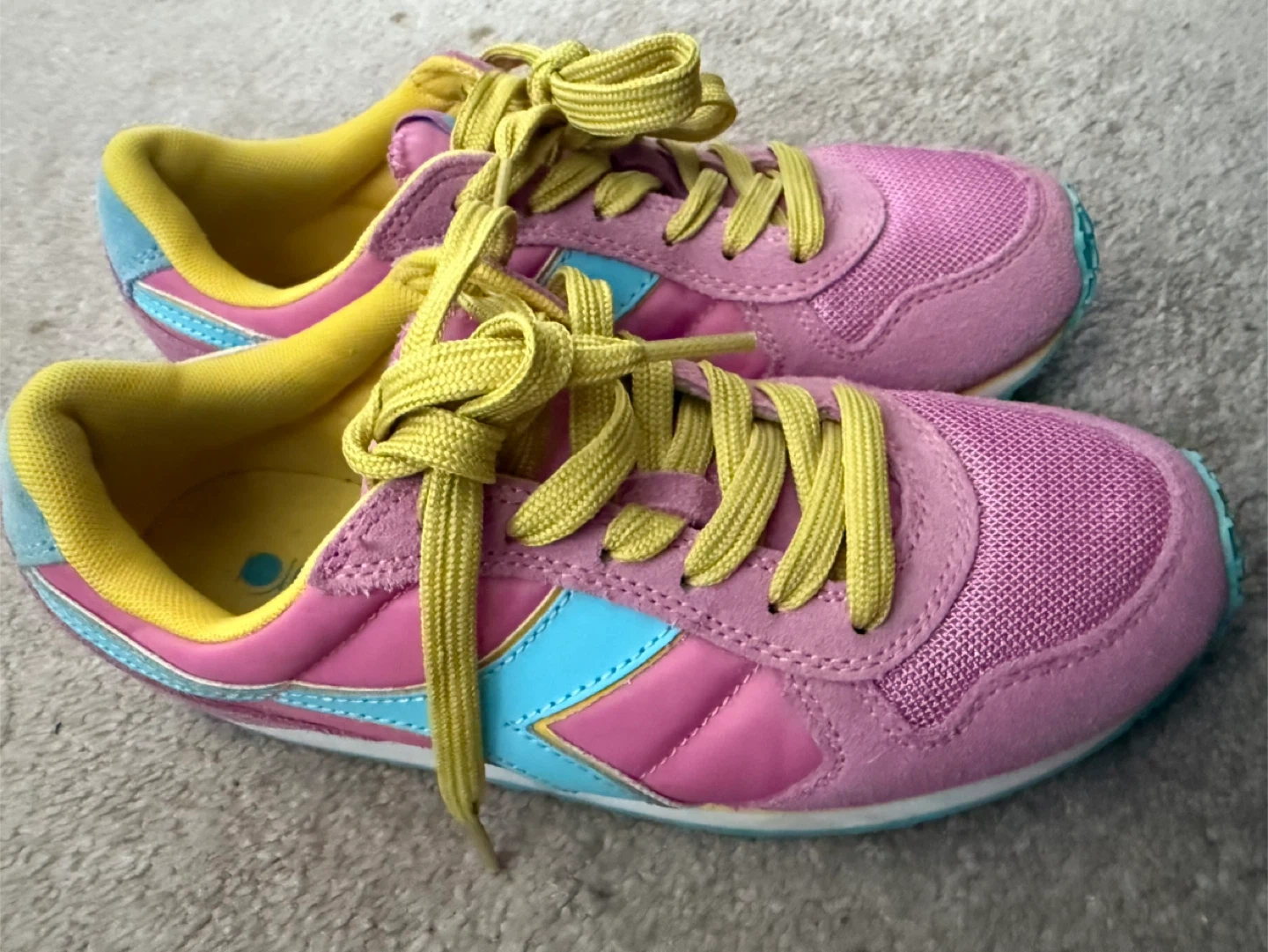 102Selling a pair of Diadora sneakers! They're a fun mix of pink, blue, and yellow, perfect for adding a pop of colour to your outfit. I'm not sure of the exact size, so please take a look at the photos to get a better idea. They're in good condition and ready for a new home!