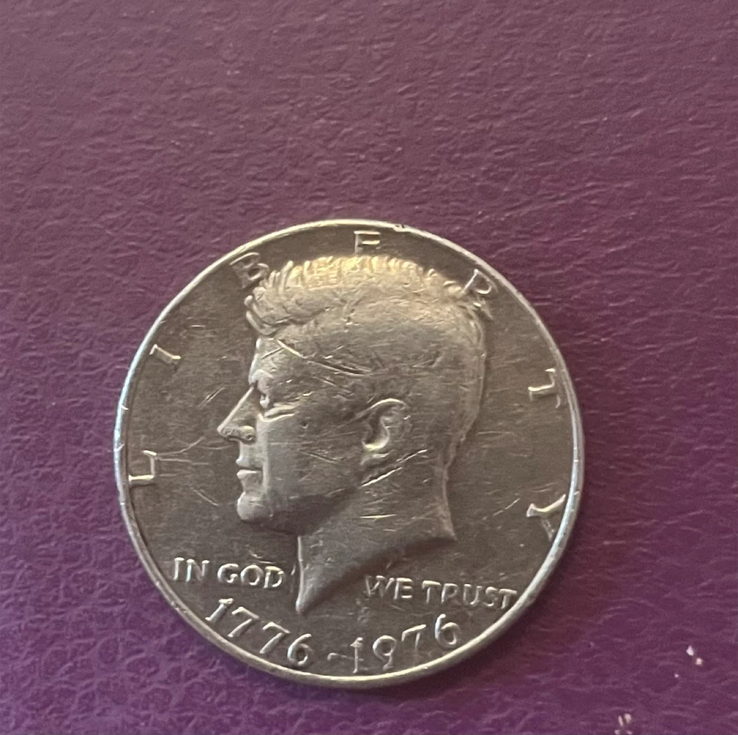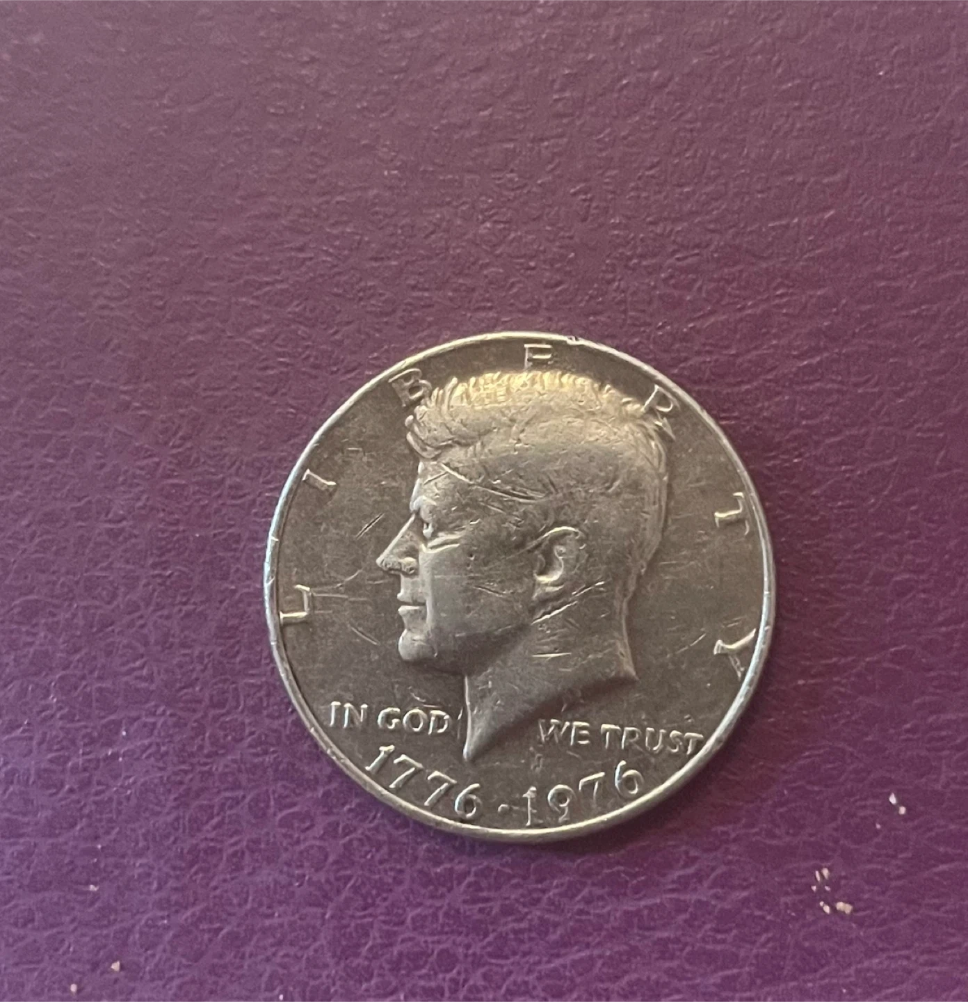 Vintage Selling a United States Half Dollar coin. It commemorates 200 years of freedom, featuring Independence Hall on one side and John F. Kennedy on the other. "In God We Trust" is inscribed on the Kennedy side