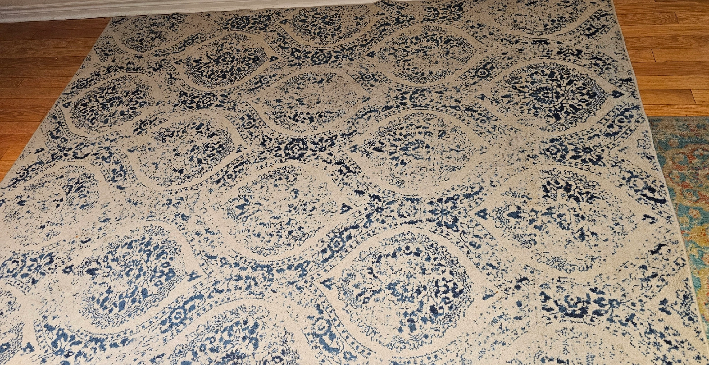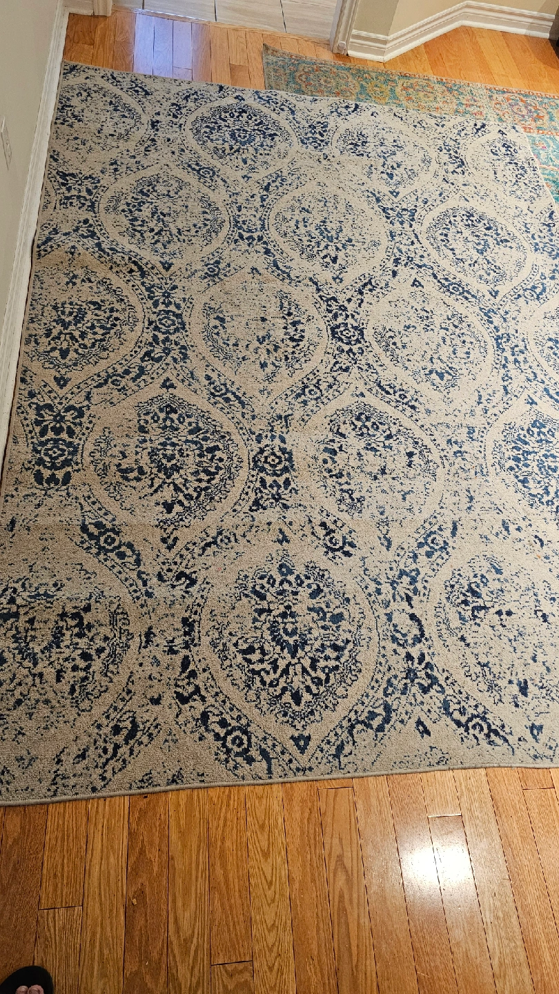 Selling a patterned area rug. It features a beige background with a navy blue design. It's in good condition and would look great in any room
