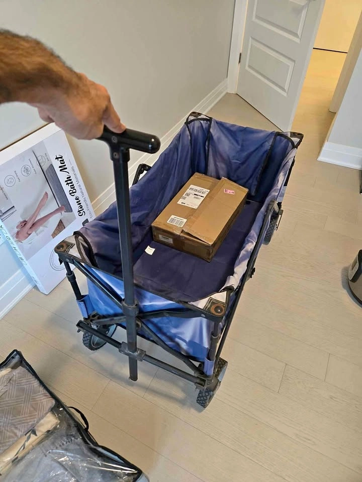 Fairly used wagon cart. It's great in terms of size. Has discoloration but no problems in terms stability. No tears on the fabric. The moving rod doesn't lock in with the cart but I still have used it plenty of times to move things around.