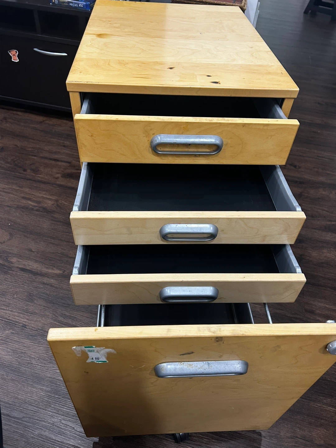 Here's a handy wooden rolling file cabinet with four drawers! It's perfect for keeping your documents organized and easy to access. The cabinet is in good condition and ready to roll into your home office or workspace