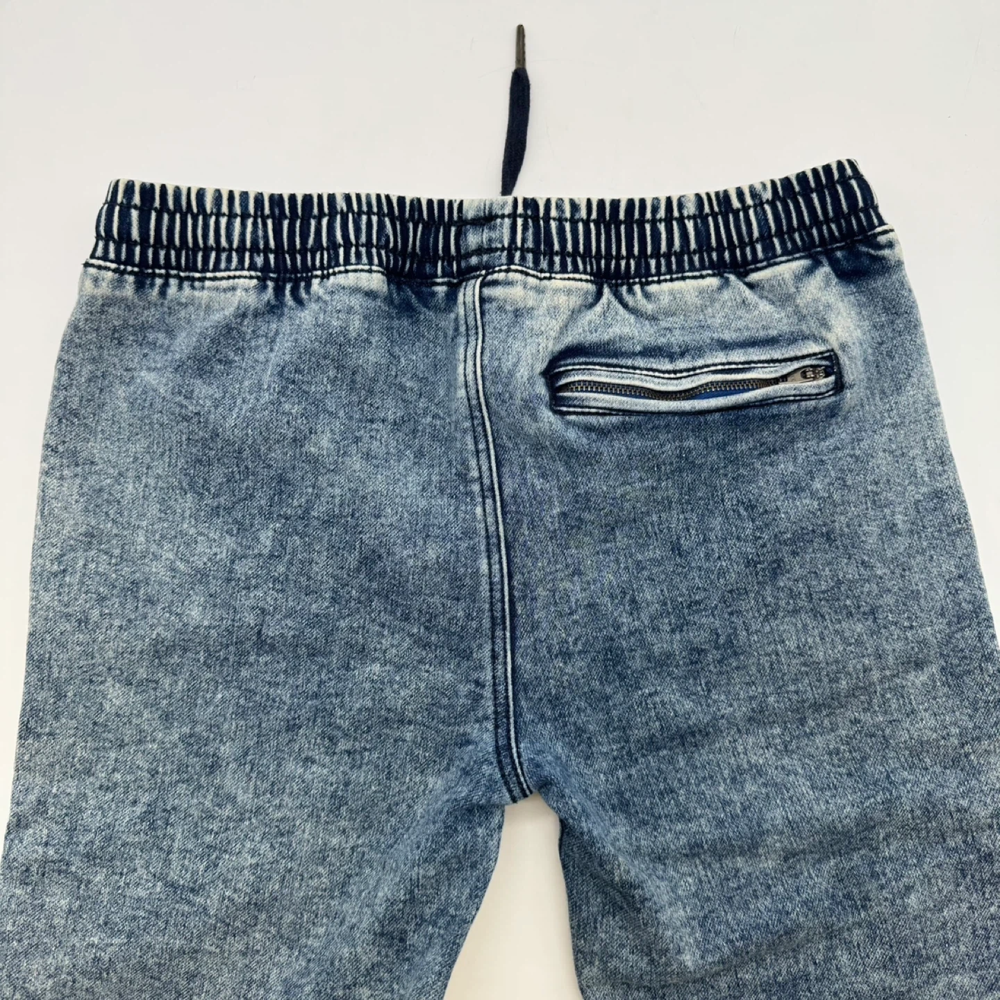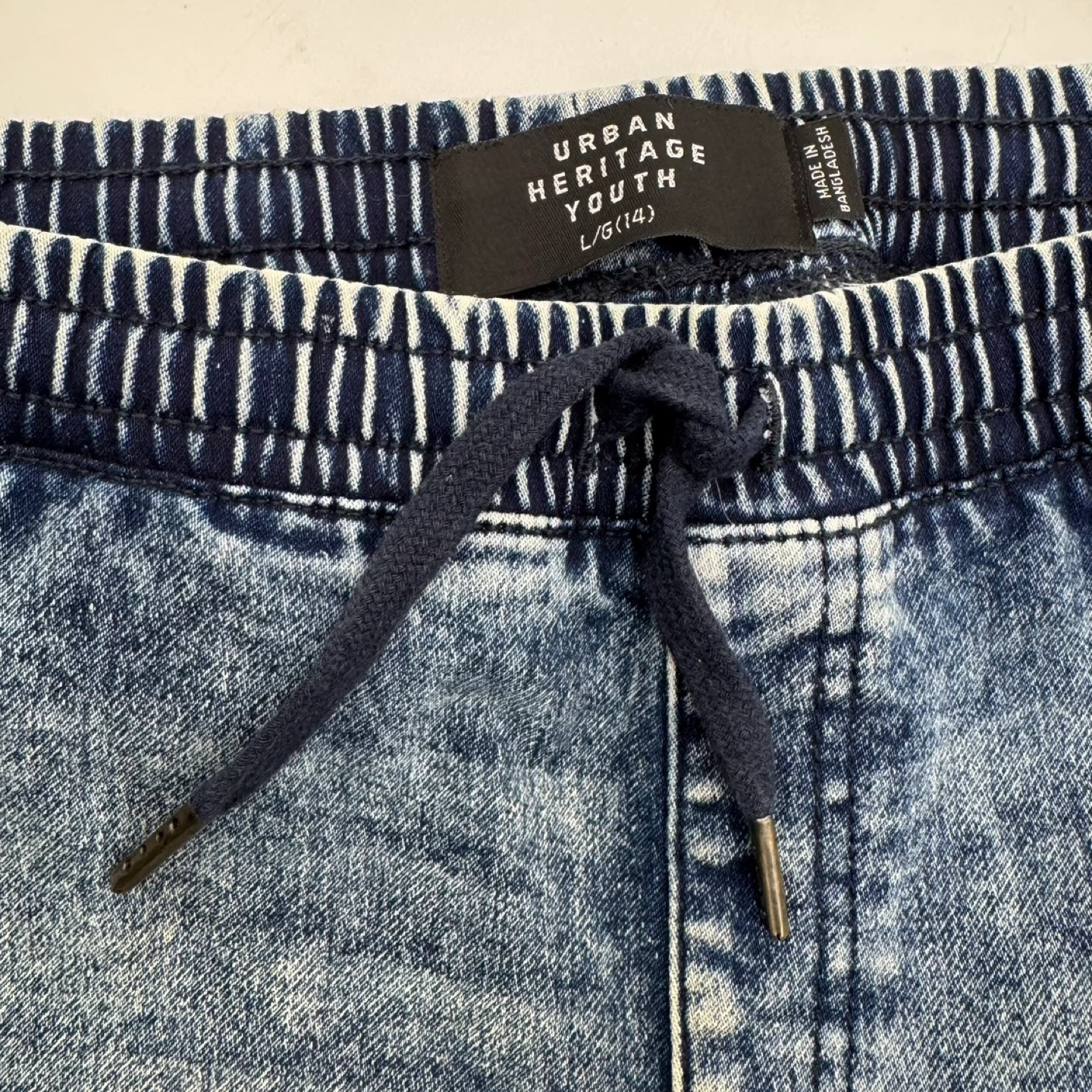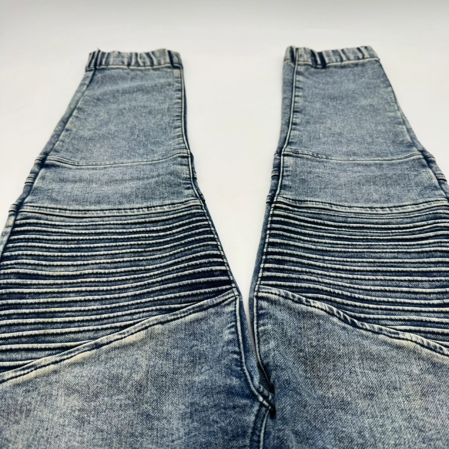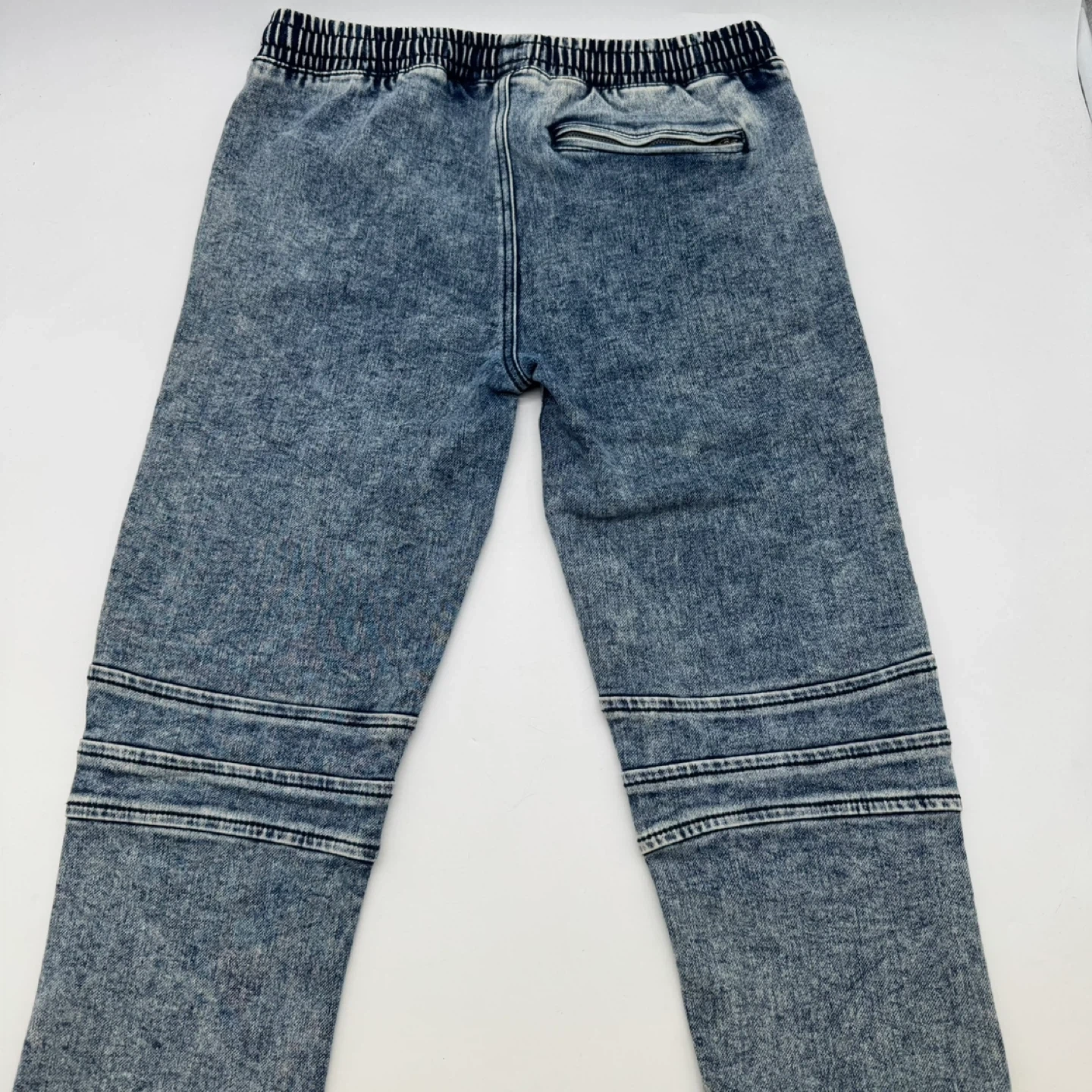 Men's Urban Heritage Youth moto-style jogger jeans in a light blue wash. These jeans feature ribbed detailing at the knees, an elastic waistband with a drawstring, and a back zip pocket. They are new without tags.