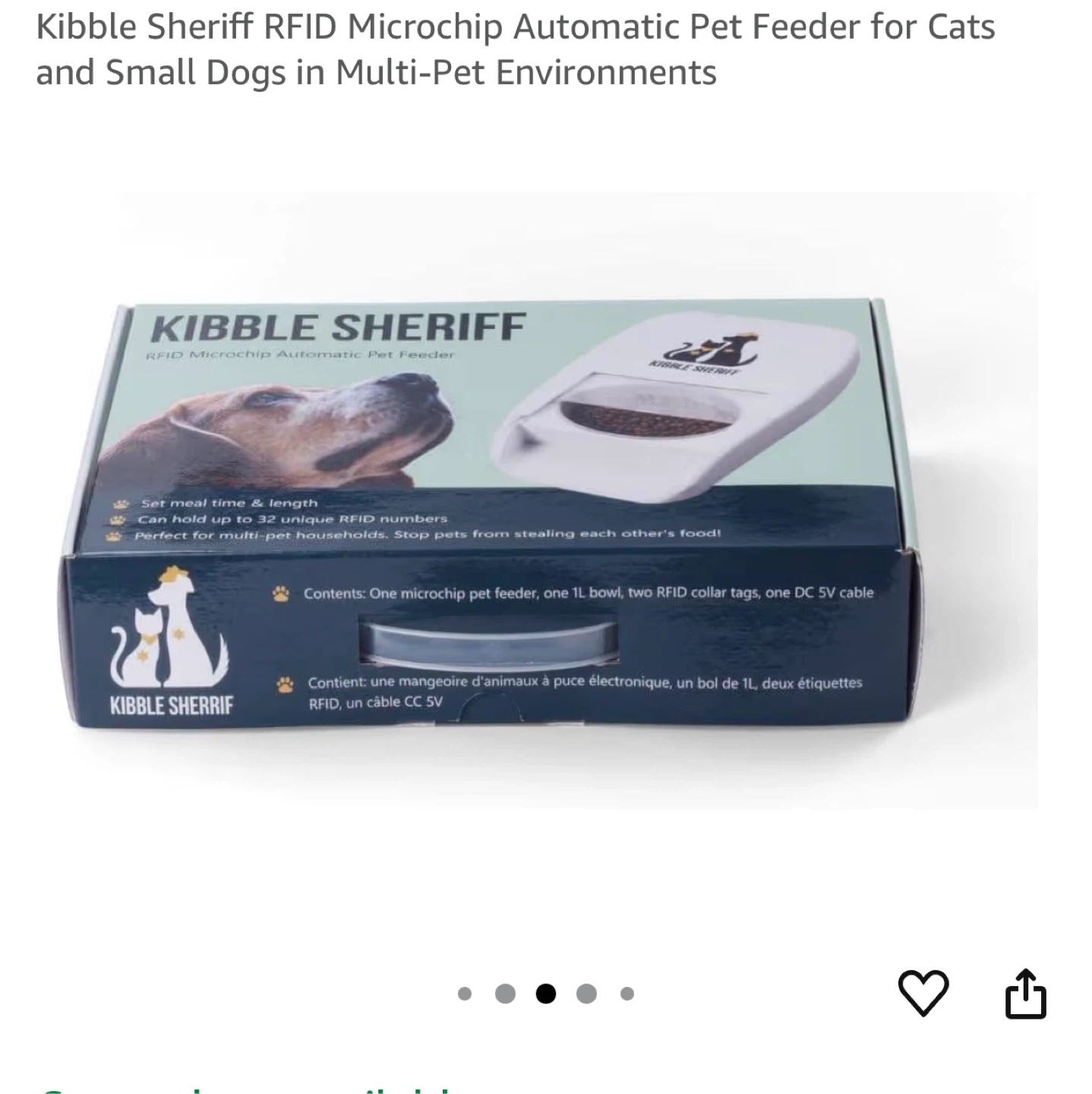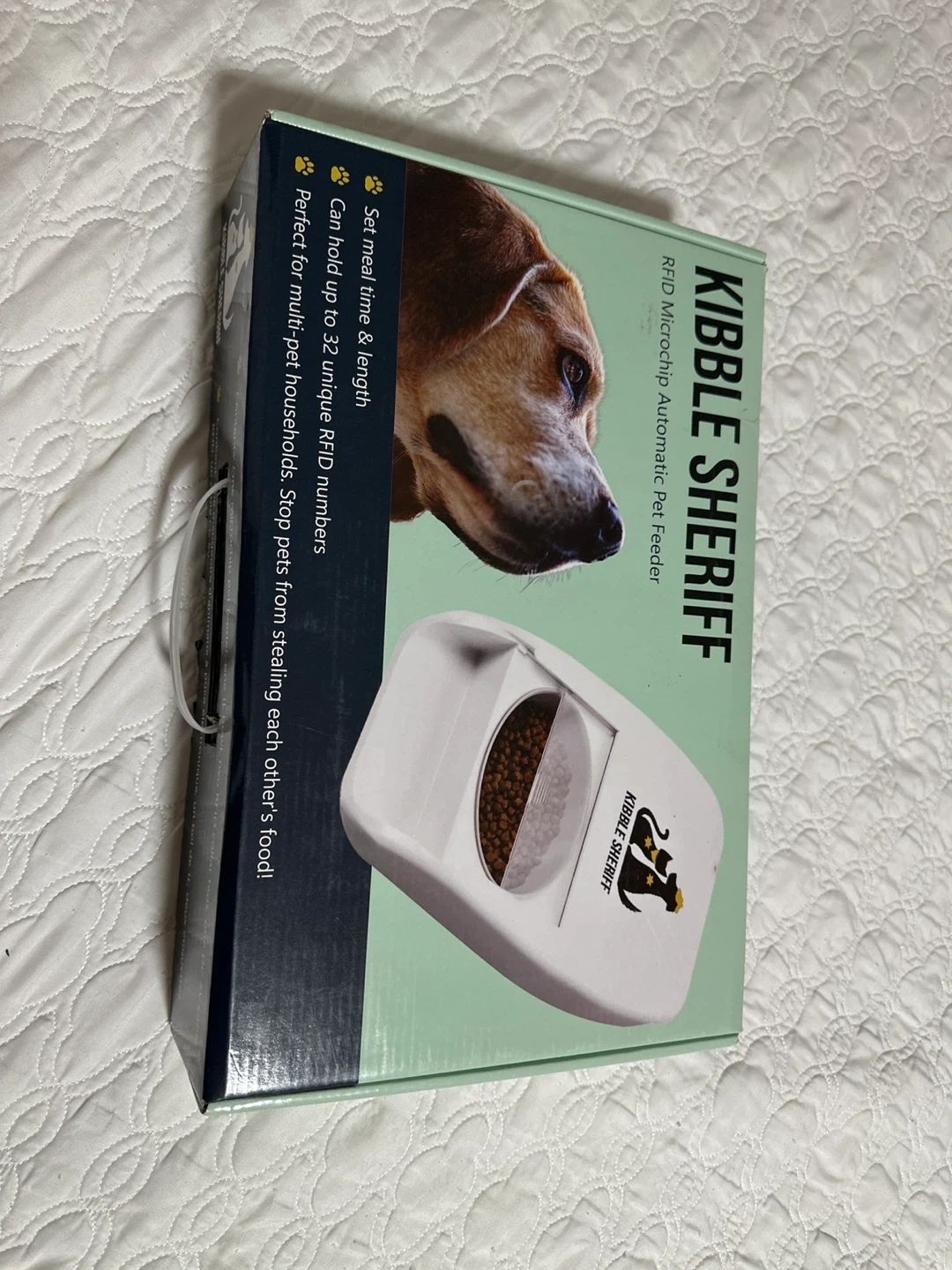 Selling a Kibble Sheriff RFID Microchip Automatic Pet Feeder, perfect for cats and small dogs in multi-pet environments! It can set meal time and length, and can hold up to 32 unique RFID numbers. It's perfect for multi-pet households, stopping pets from stealing each other's food! The box includes one microchip pet feeder, one bowl, two RFID collar tags, and one DC 5V cable