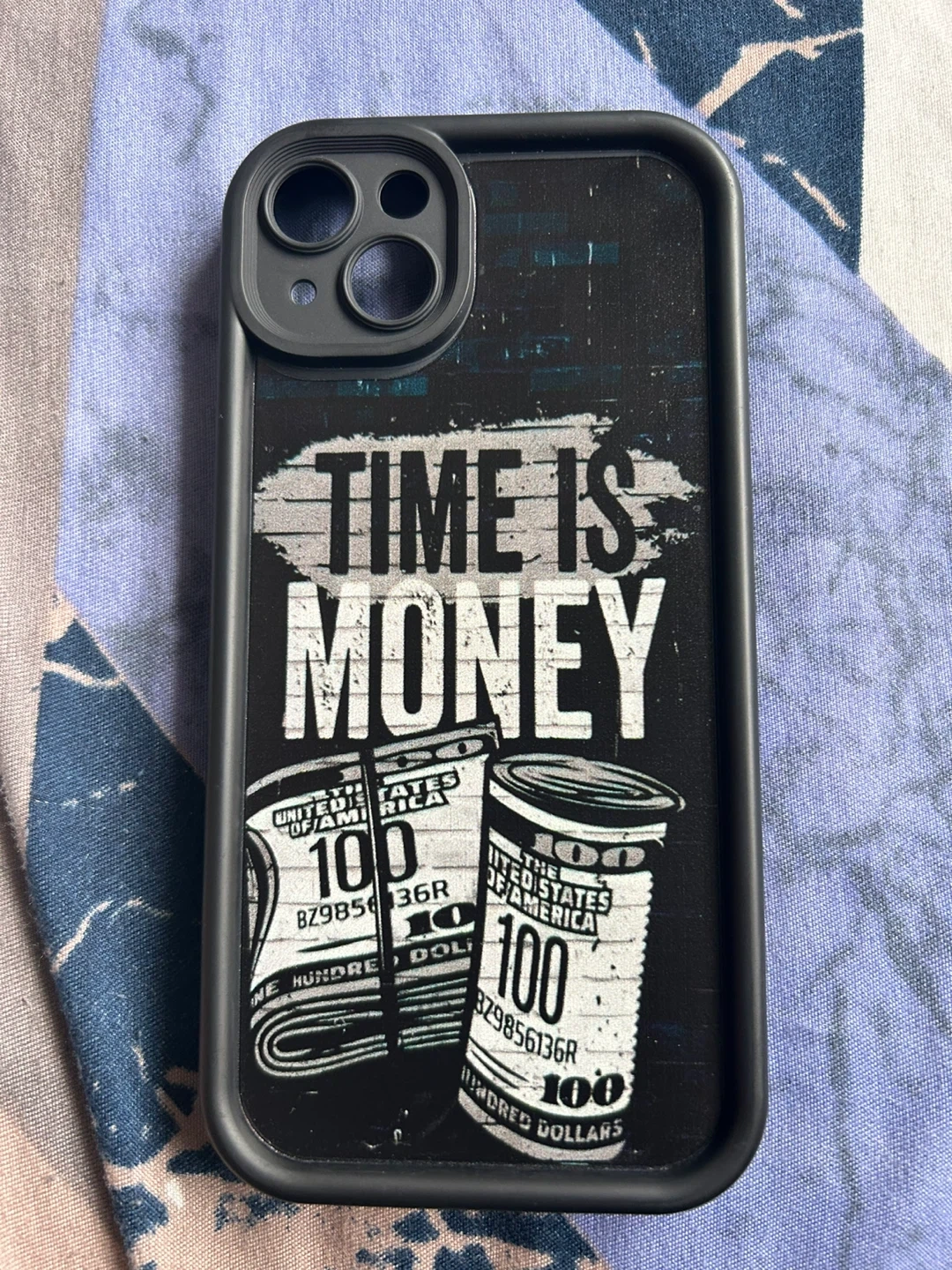 Selling a new iPhone case with a 'Time is Money' design. It features images of hundred-dollar bills. It's in good condition and ready for a new home!