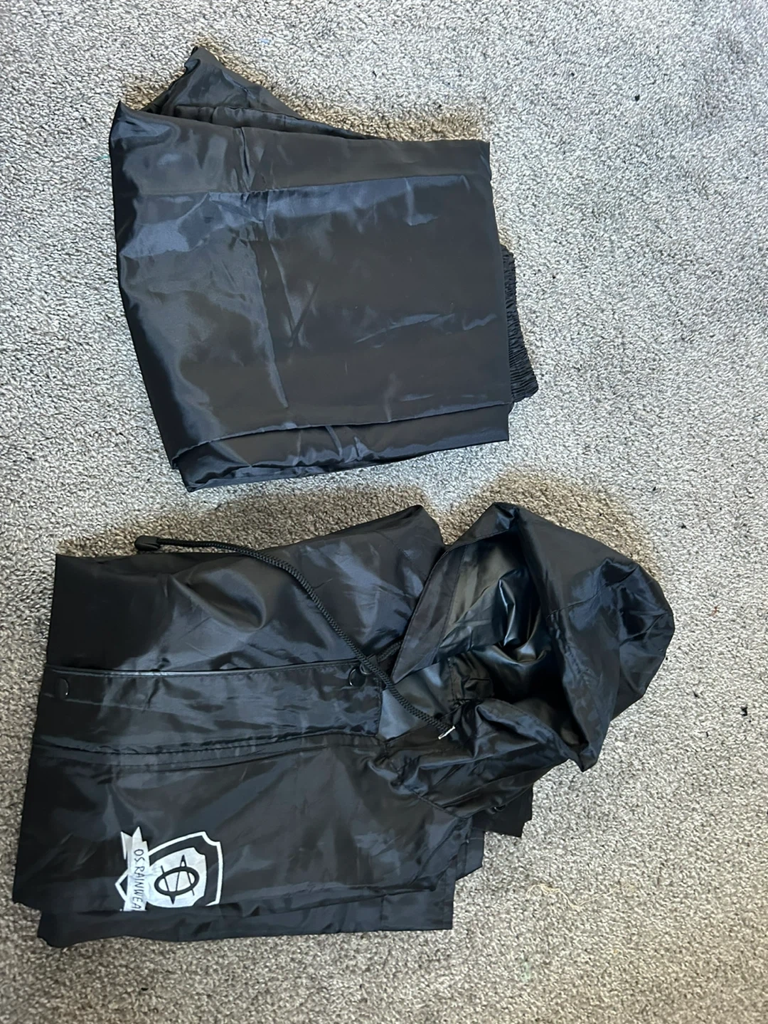 Selling a black OS Trachten rain suit. It includes both the jacket and pants. Perfect for staying dry on those rainy days!