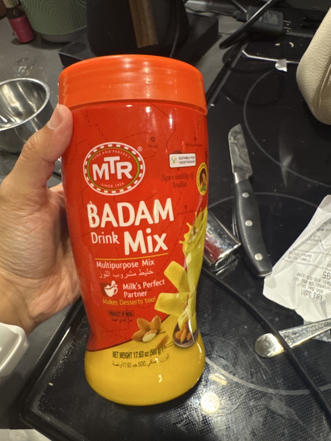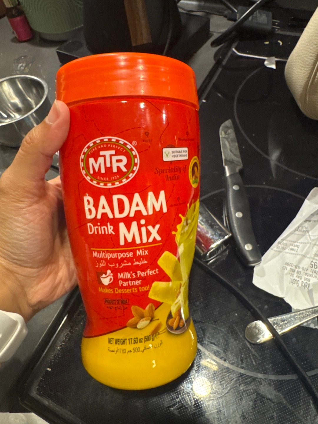 Selling a bottle of MTR Badam Drink Mix! This is a multipurpose mix that's a perfect partner for milk and makes delicious desserts too. Net weight is 17.63 oz (500g).