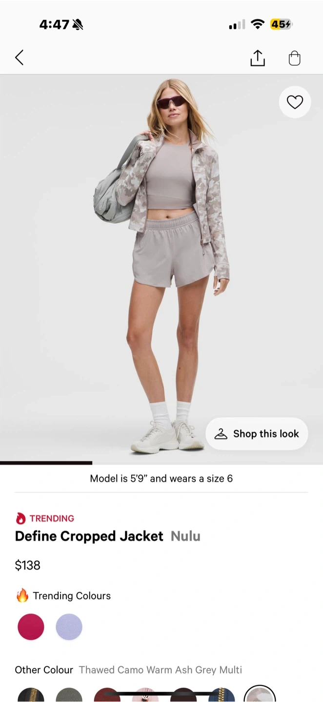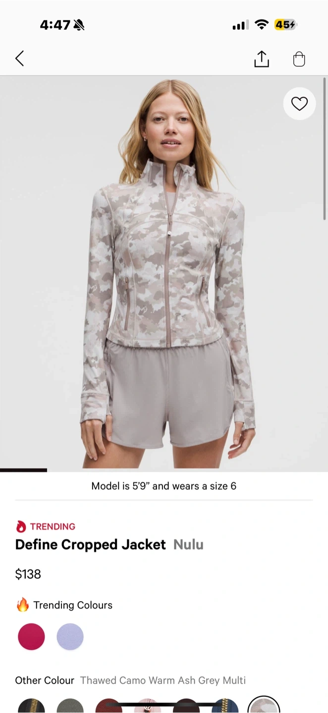 35Selling a Lululemon Define Cropped Jacket in a size 6! The colour is a really nice Thawed Camo Warm Ash Grey Multi. Retails for $138!