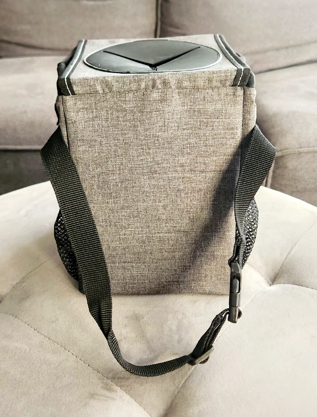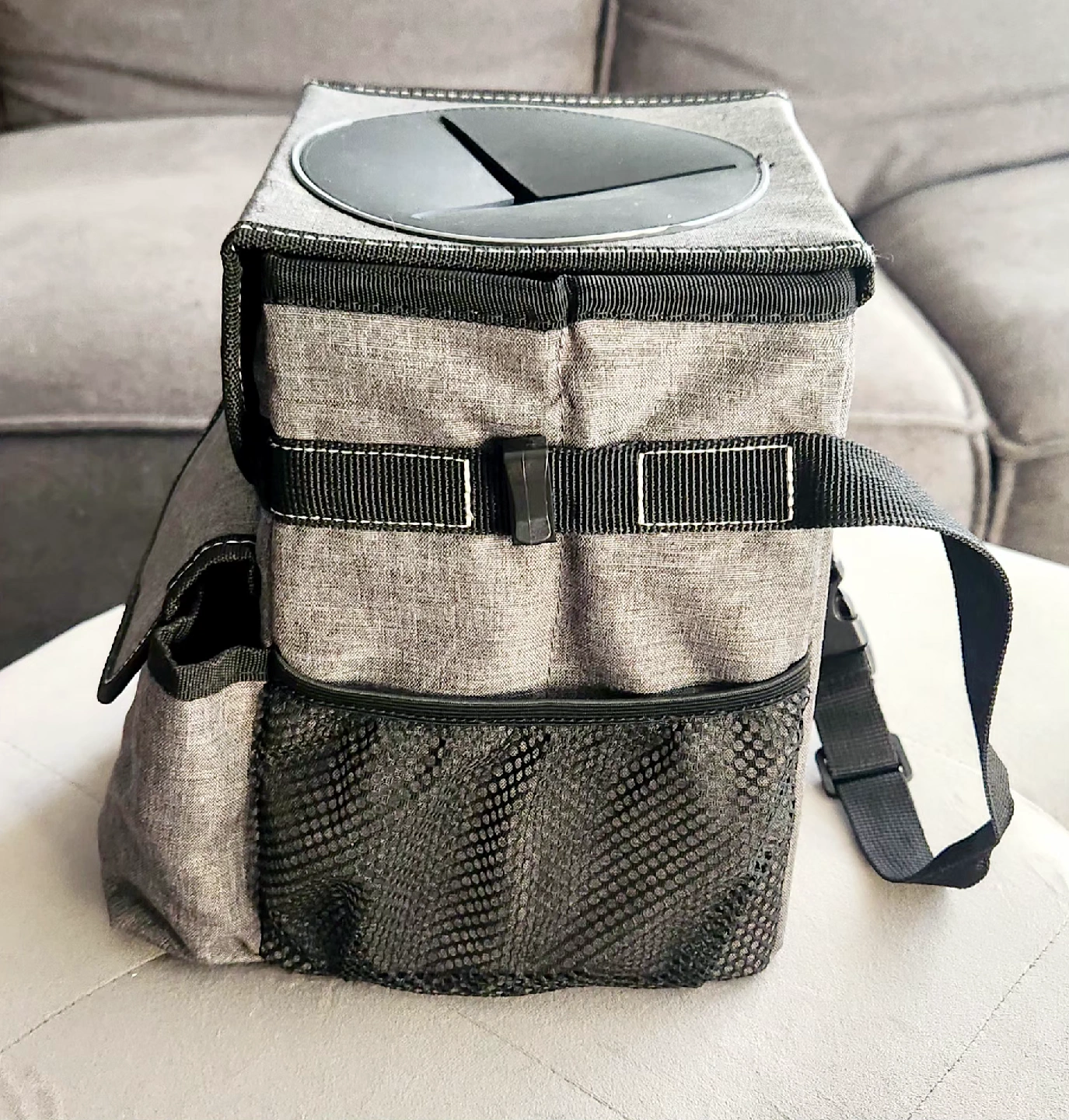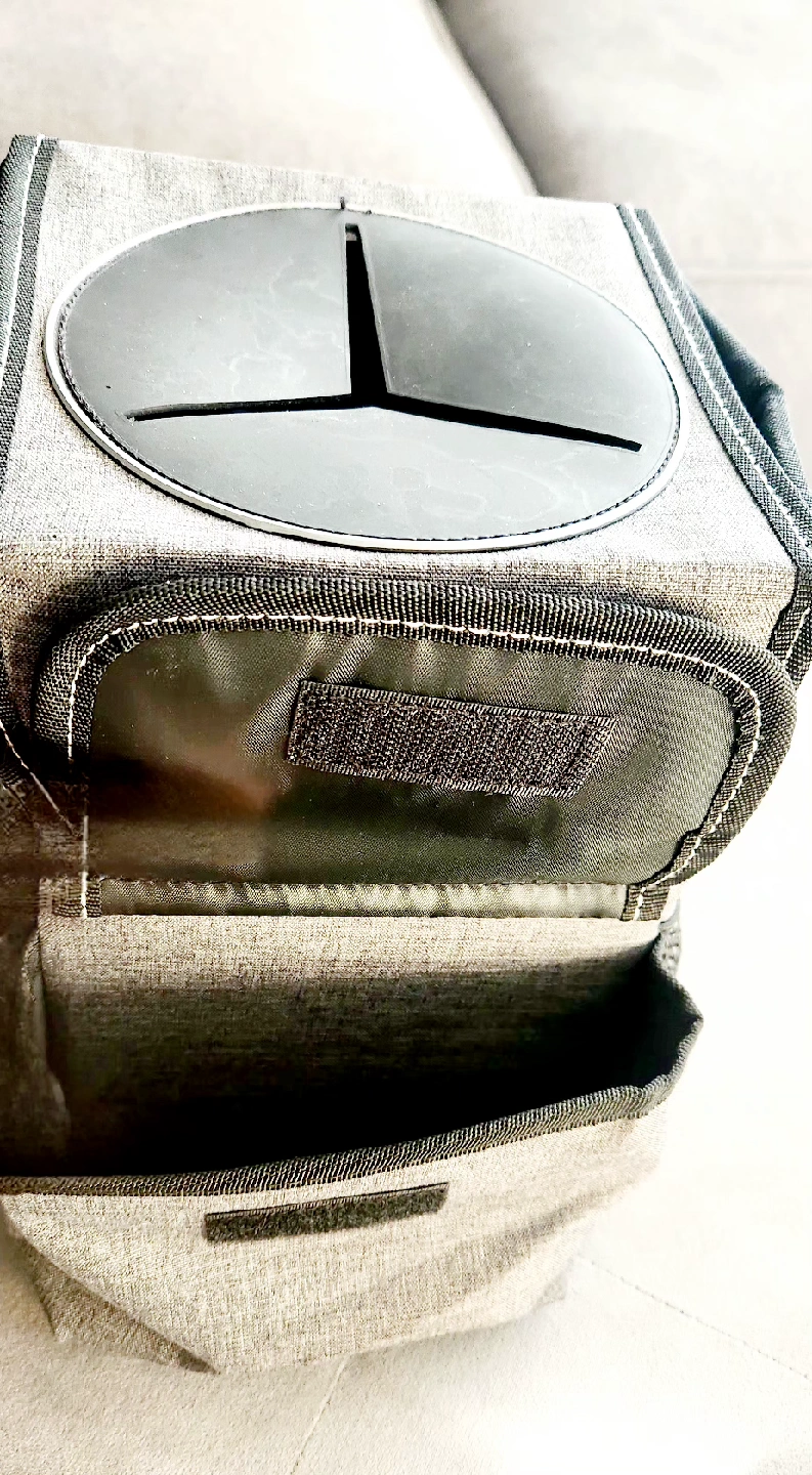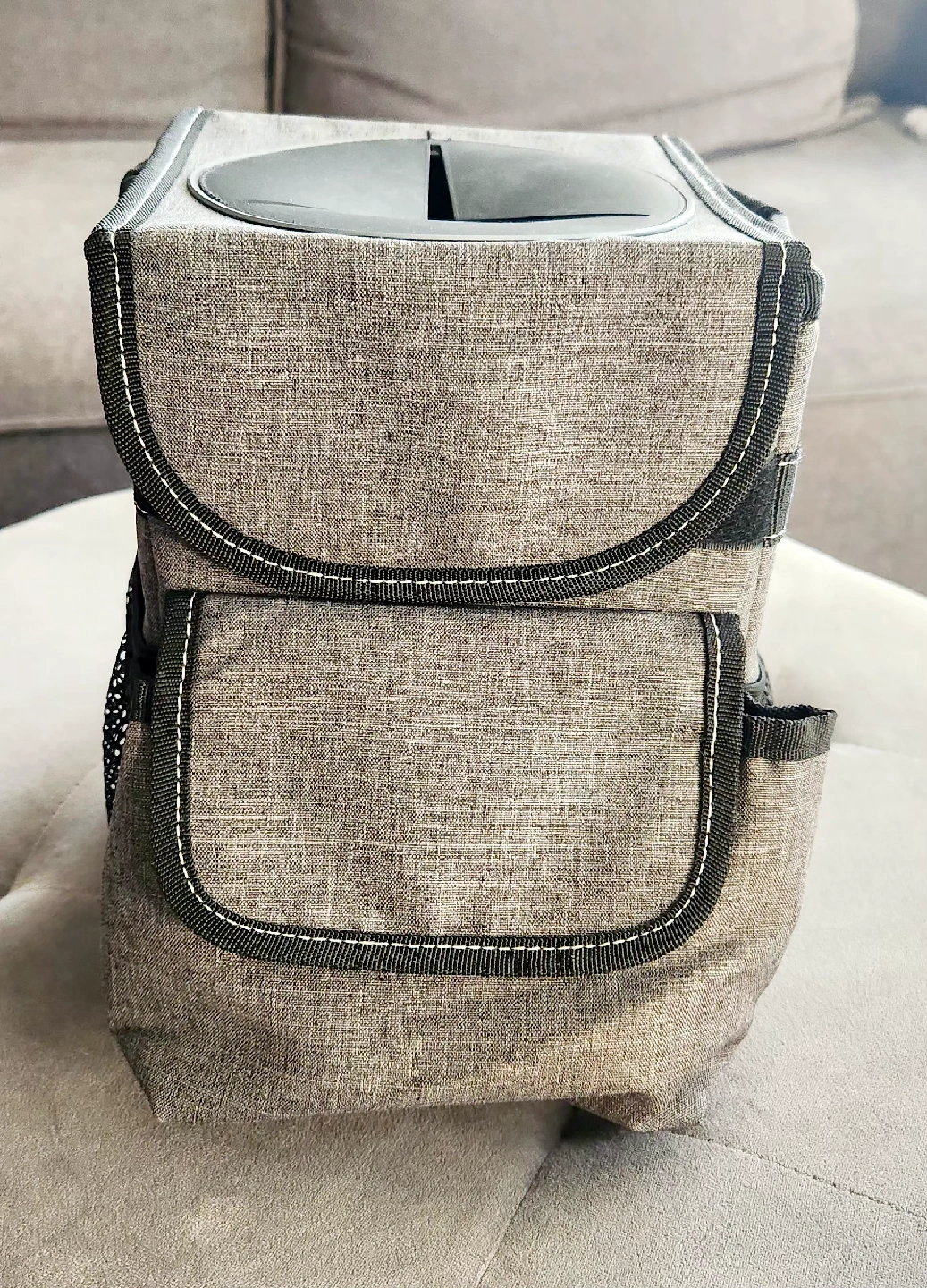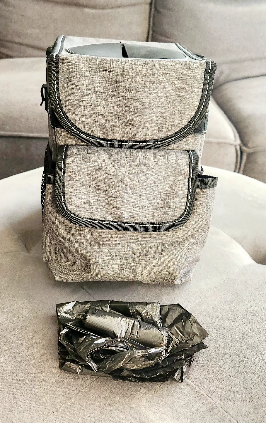 85Selling a handy car trash can! Features a velcro lid with easy access slits and some trash bags to get you started. Gray fabric container with black detailing designed to keep a vehicle tidy. Like new condition. Features: - Waterproof lining: To prevent leaks and make cleaning easier. - Storage pockets: Three outer pockets for additional storage of items. - Attachment options: A snap and adjustable strap to secure the bin to a seat or console. - Material: Made from a durable, washable fabric. - Measures 6.5" wide, 9.25" high and between 6" to 8" deep.