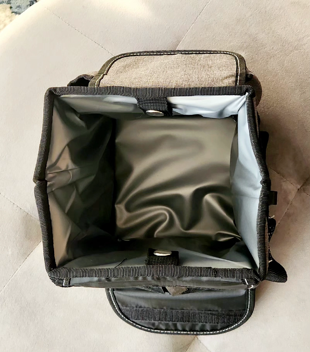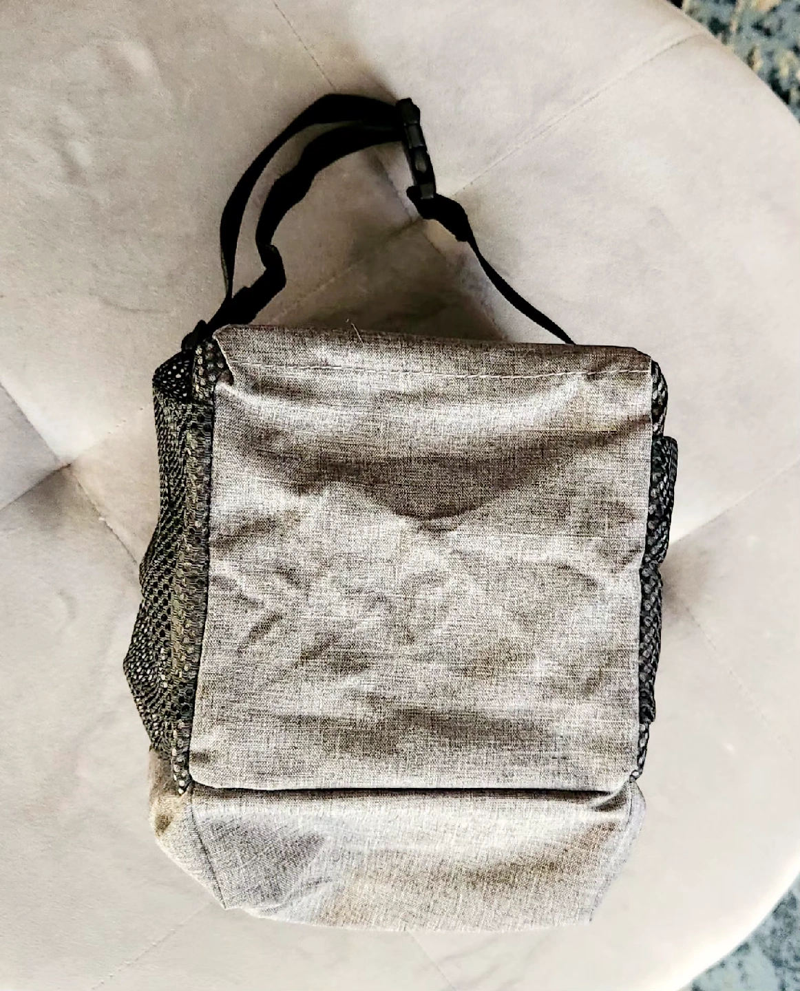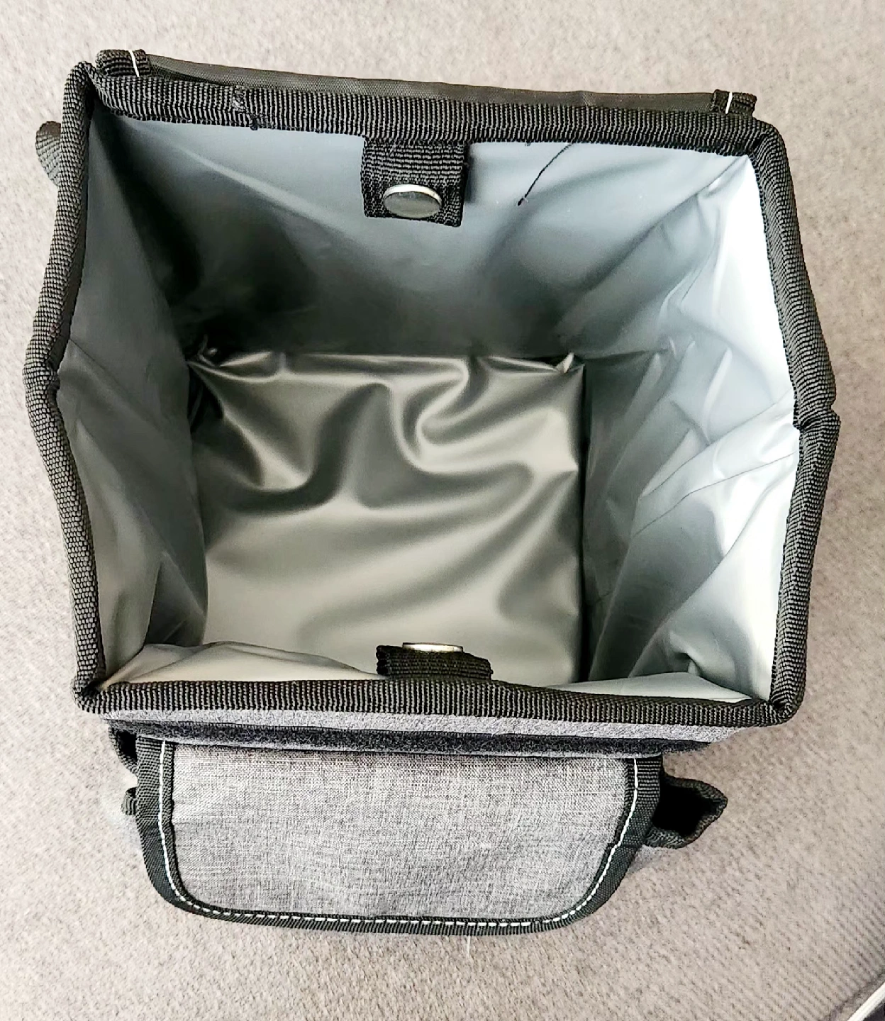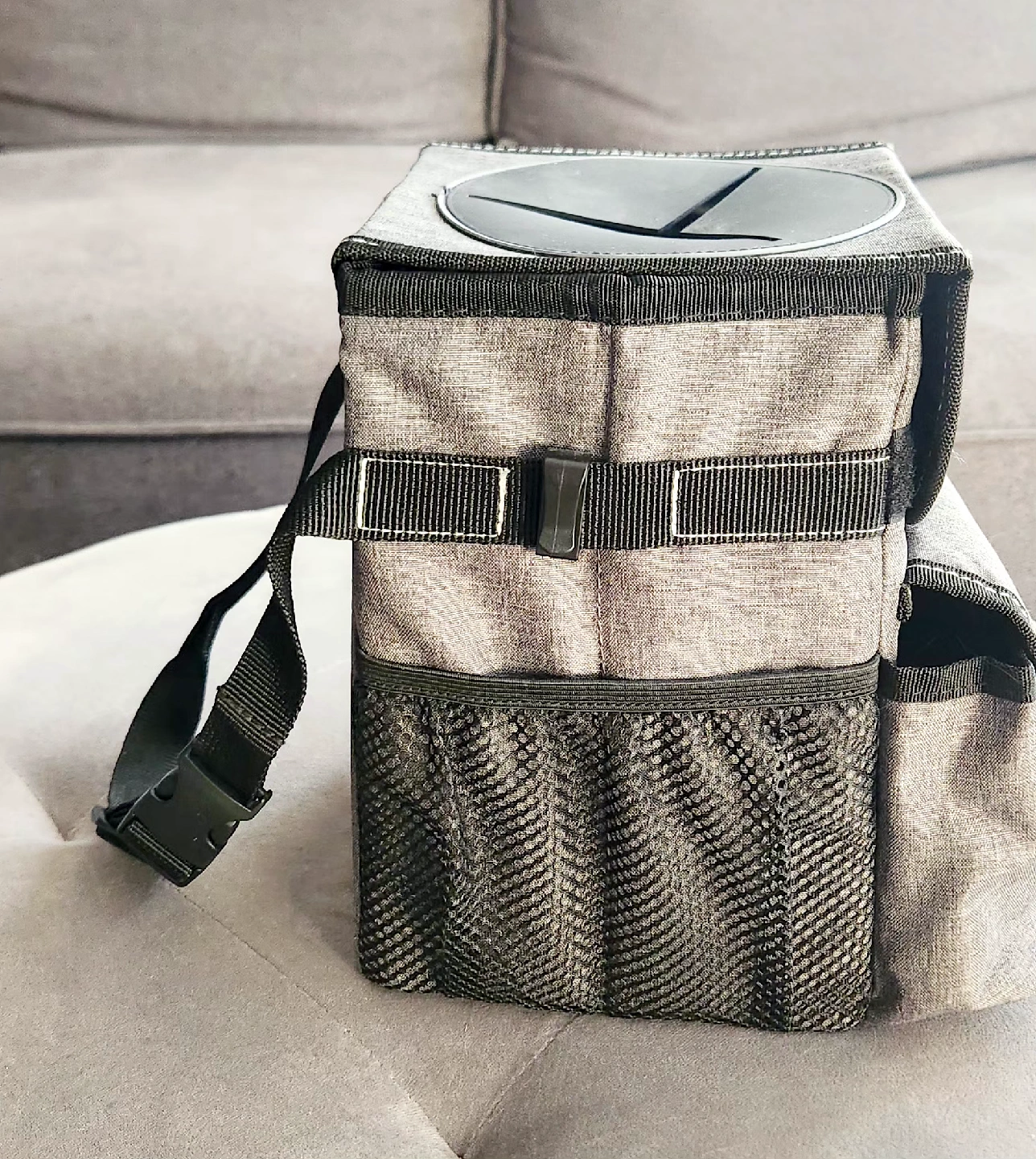 85Selling a handy car trash can! Features a velcro lid with easy access slits and some trash bags to get you started. Gray fabric container with black detailing designed to keep a vehicle tidy. Like new condition. Features: - Waterproof lining: To prevent leaks and make cleaning easier. - Storage pockets: Three outer pockets for additional storage of items. - Attachment options: A snap and adjustable strap to secure the bin to a seat or console. - Material: Made from a durable, washable fabric. - Measures 6.5" wide, 9.25" high and between 6" to 8" deep.