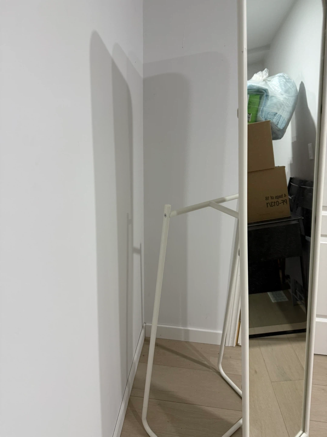Selling a standing mirror with a white frame. It's in great condition and ready to brighten up your space! Perfect for a bedroom or dressing area, it's both stylish and functional