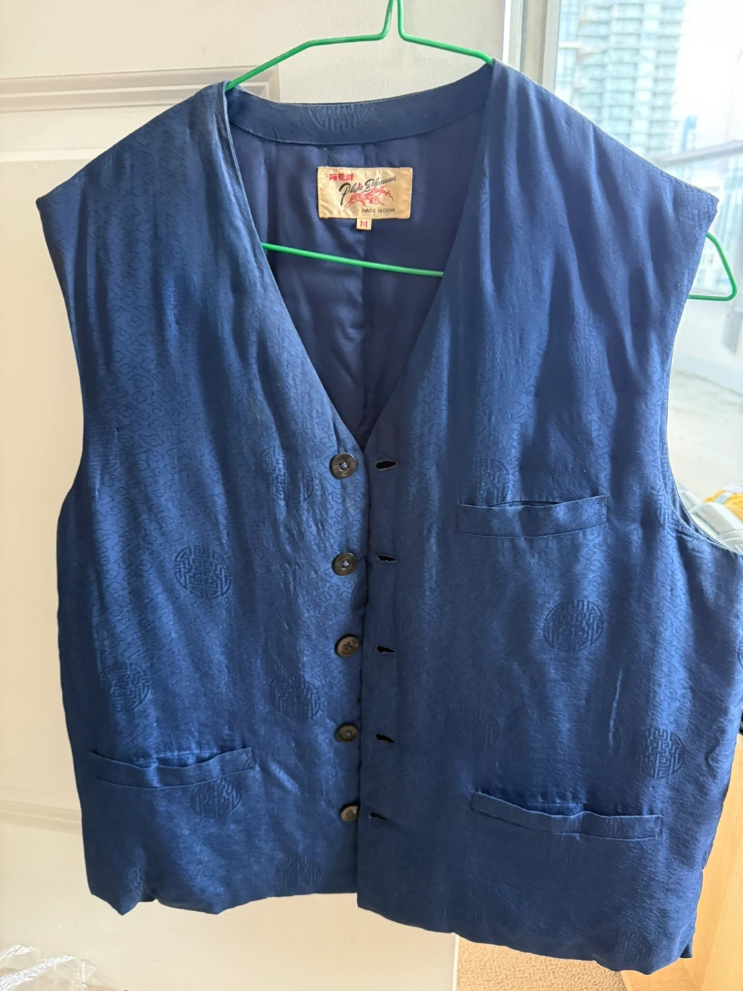 Buy & SellVintage Chinese Blue Vest Size MVintage Chinese Blue Vest Size M$30Traditional Chinese quilted vest in size M! It's a lovely blue colour and has a unique pattern embossed into the silk fabric.0 chats·1 favorites·9 viewsSELLERWillBrentwood100 reviewsWHERE TO MEETBrentwood