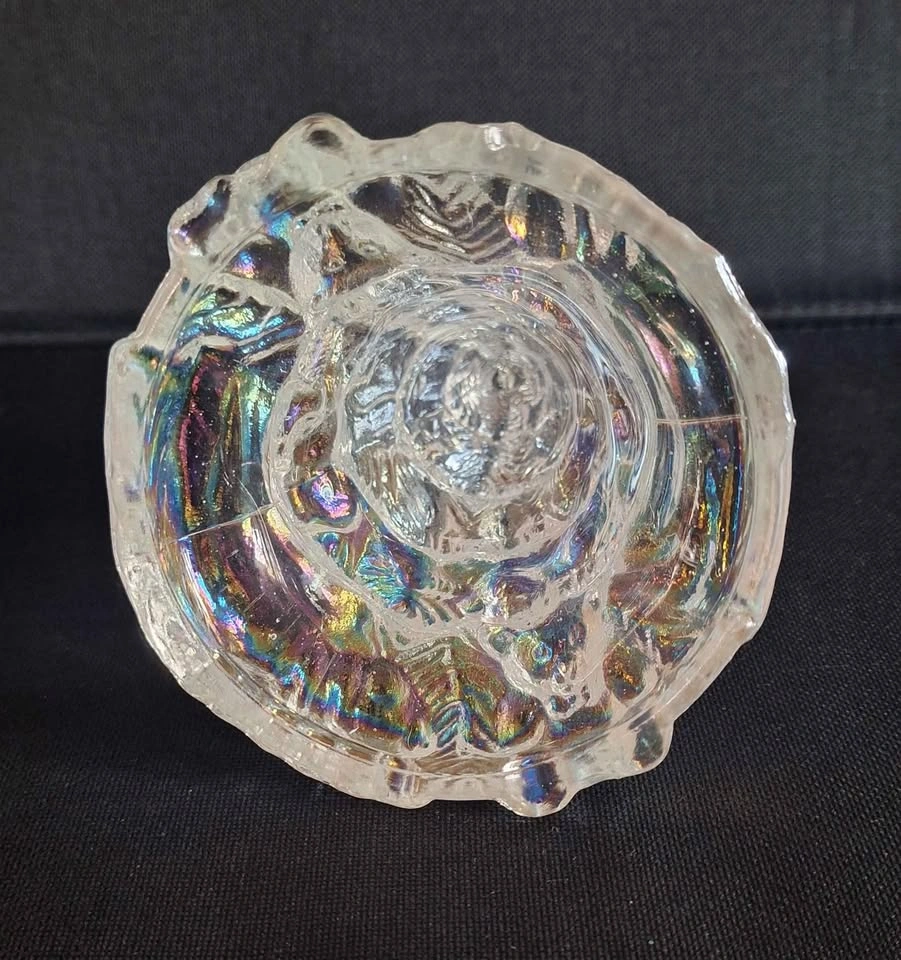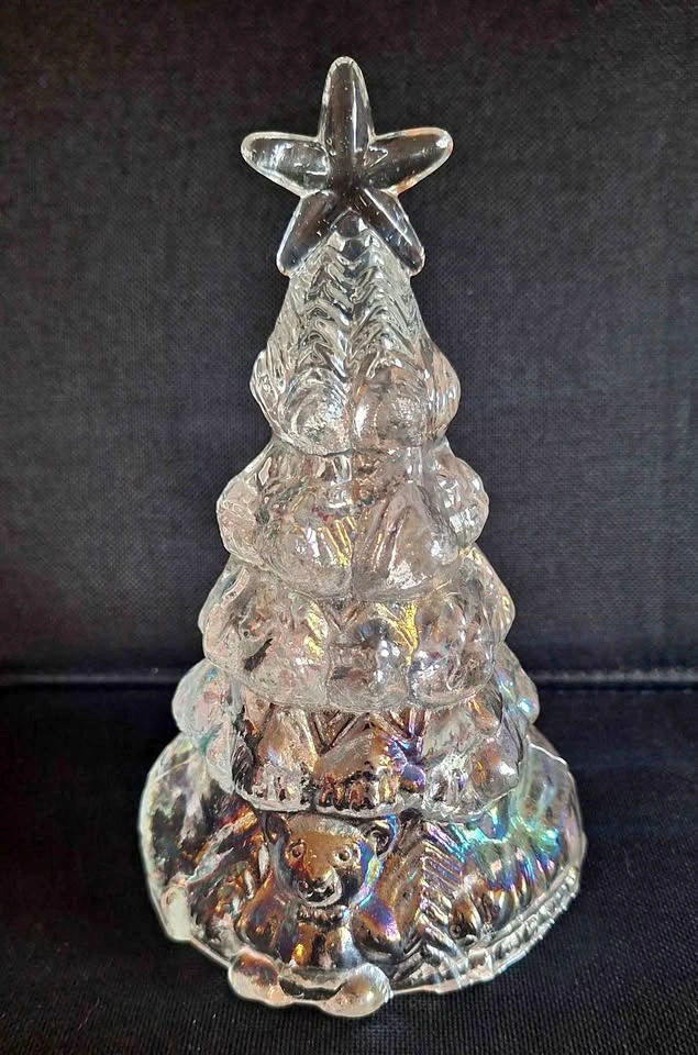 This iridescent glass Christmas tree features a charming design with 6.25" tall teddy bears at the base and swirled balls adorning the tree. The glass material gives it a clear and elegant appearance, perfect for adding a festive touch to any holiday decor. The iridescent finish likely provides a shimmering and colorful effect when light hits the tree, creating a whimsical and eye-catching display for the Christmas season.