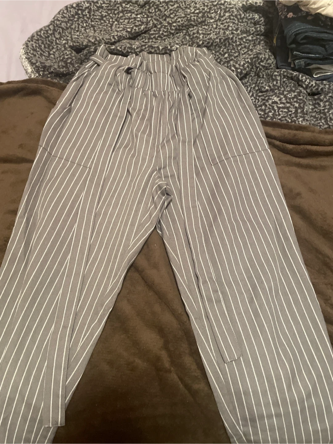 Selling a pair of grey pants with white stripes. They have a comfortable, relaxed fit and are perfect for casual wear. The material is soft and breathable, making them great for everyday use! They are in good condition with minimal wear and tear