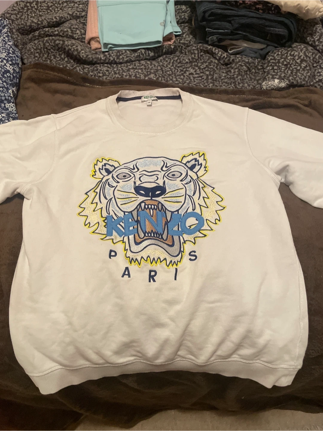 Selling a Kenzo Paris sweatshirt in size medium! It's white with the iconic tiger logo embroidered on the front. A stylish and comfortable piece for any wardrobe. Feel free to reach out if you're interested!