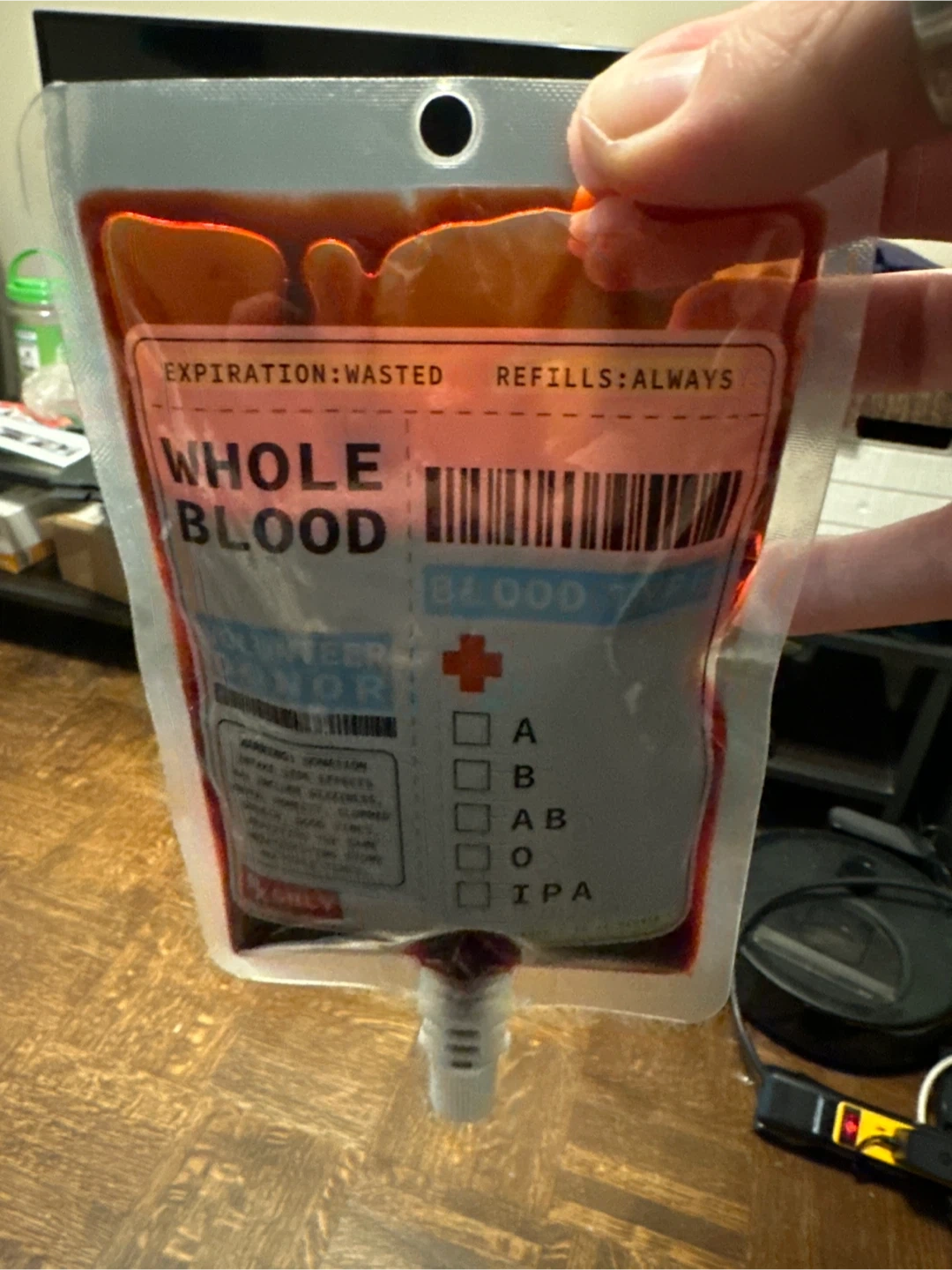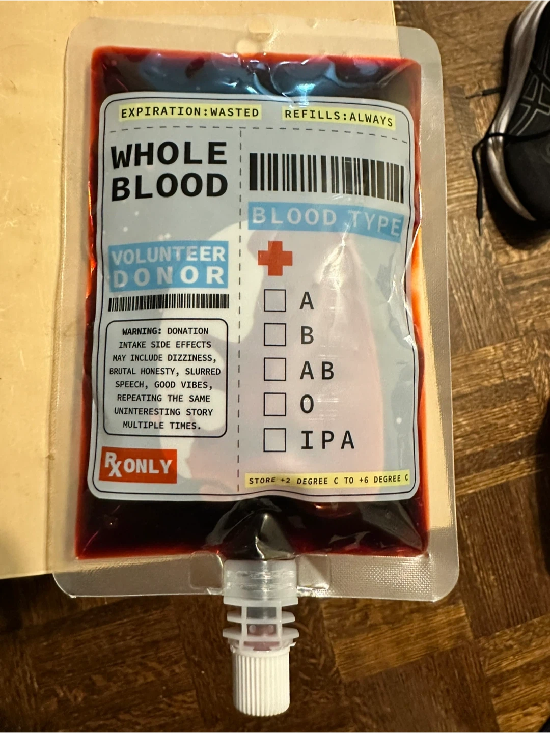 This is a novelty blood IV pouch designed to look like a bag of whole blood. It's a fun item for parties or Halloween.