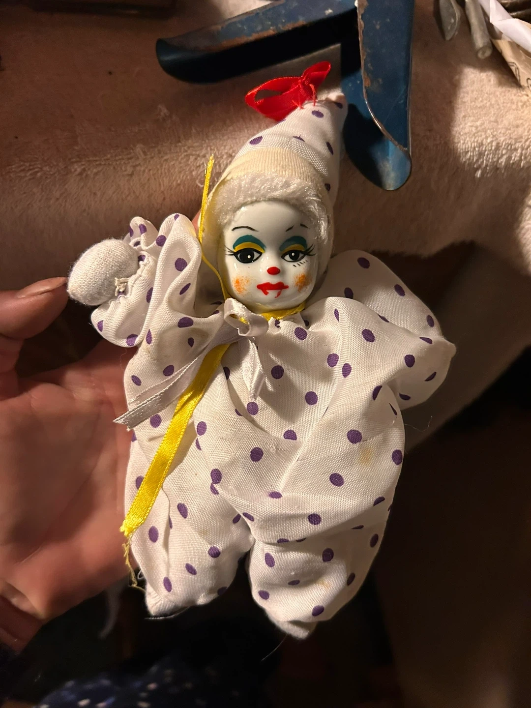 🎃 Selling a cute (creepy) vintage porcelain face clown doll! It has a white outfit with purple polka dots and a little red bow on its hat. Would make a great addition to a collection or a fun toy!