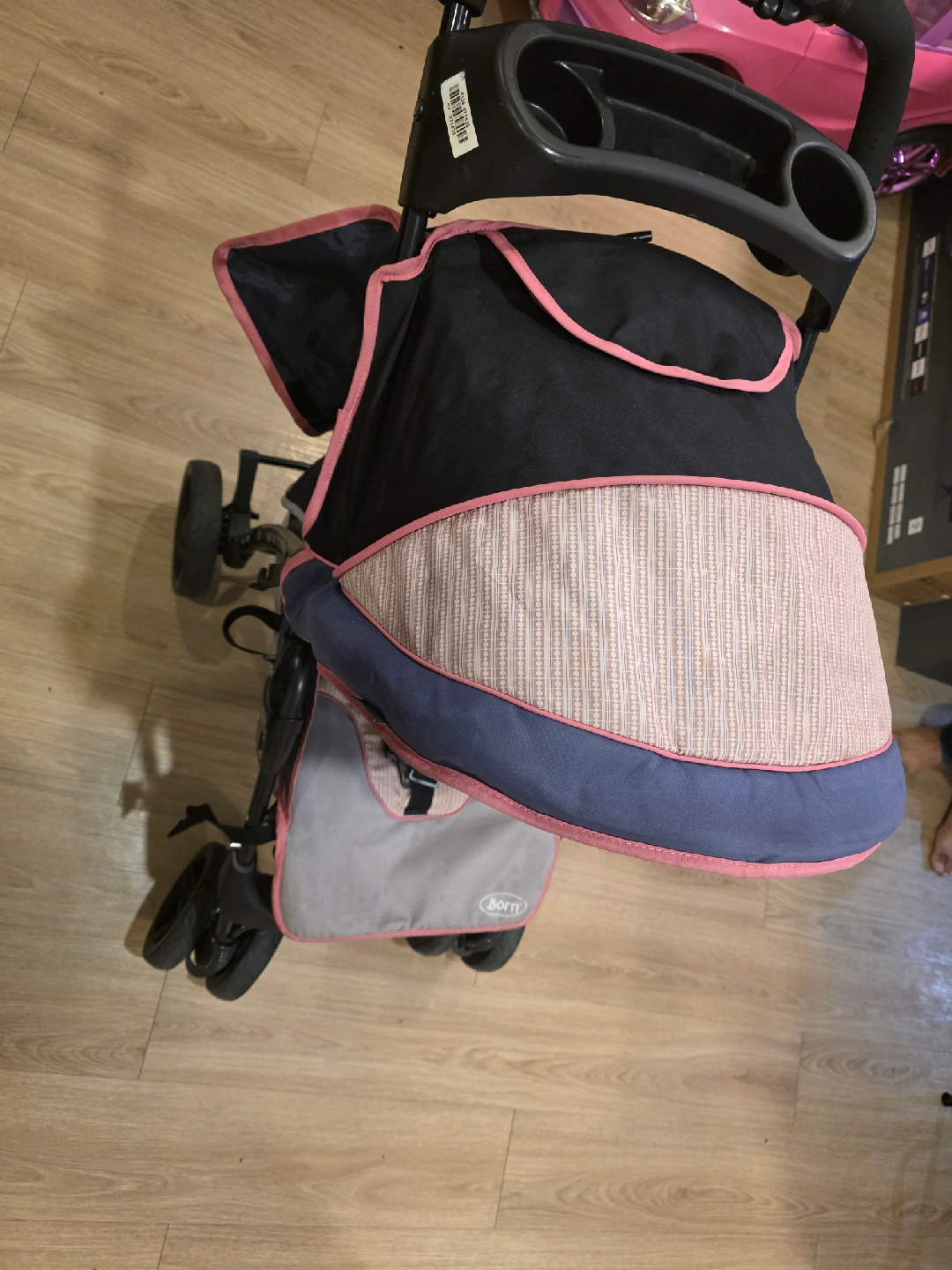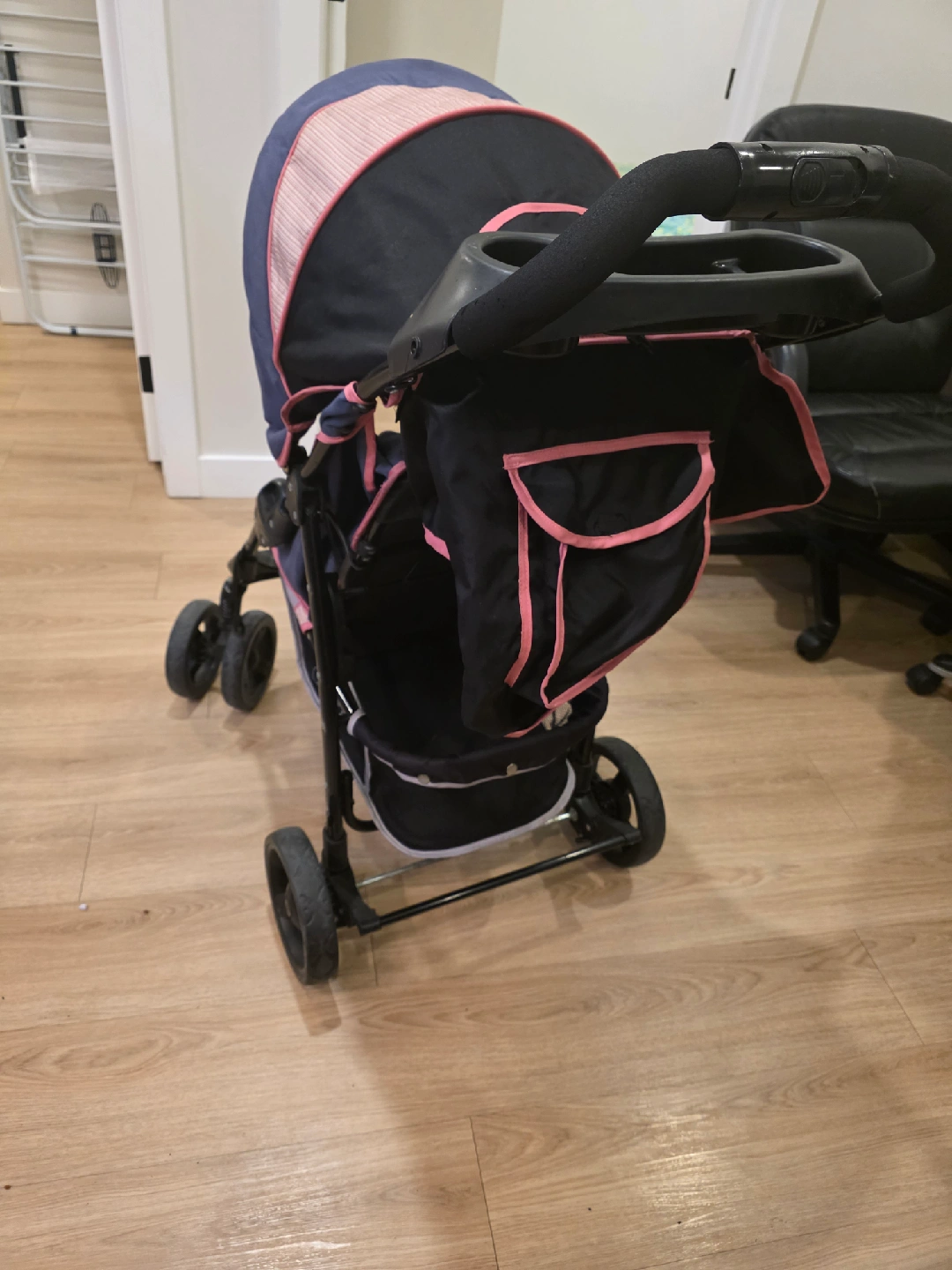 Selling a Borrí stroller in great condition! It features a navy blue and pink trim design. Perfect for taking your little one out and about. It also includes a convenient cup holder for parents and a storage basket underneath for all your essentials