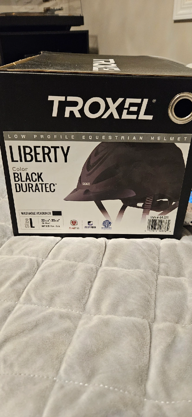 I'm selling a brand new Troxel Liberty equestrian helmet in black, size large! It's still in the original box and packaging, with the owner's manual included. The helmet features a low profile design and a washable headliner for comfort and hygiene. It fits head sizes 22 3/8" - 23 1/8".