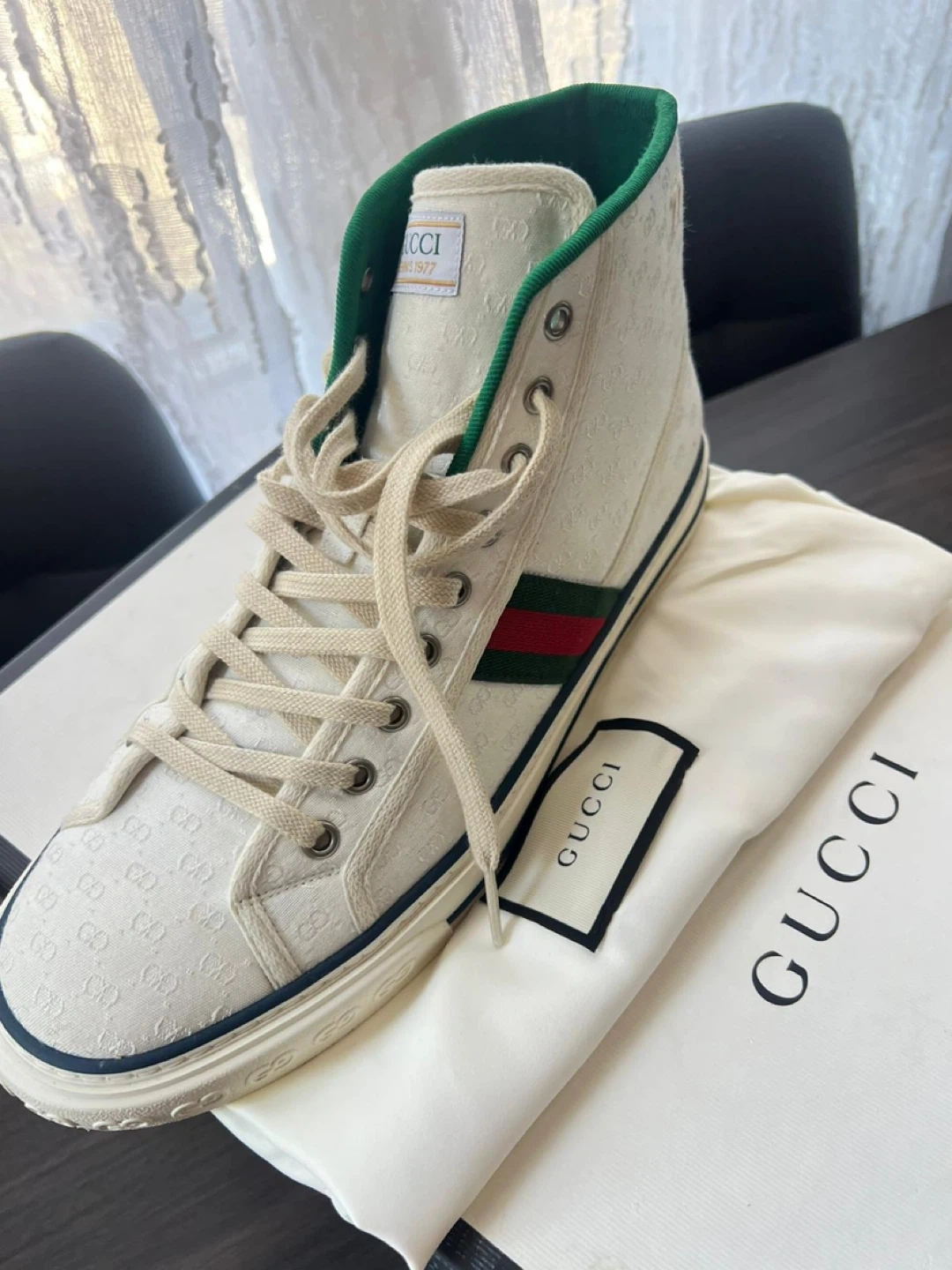 Selling a pair of Gucci Tennis 1977 high-top sneakers! These sneakers feature the iconic Gucci logo pattern and the classic green and red web stripe. They come with the original box and dust bags