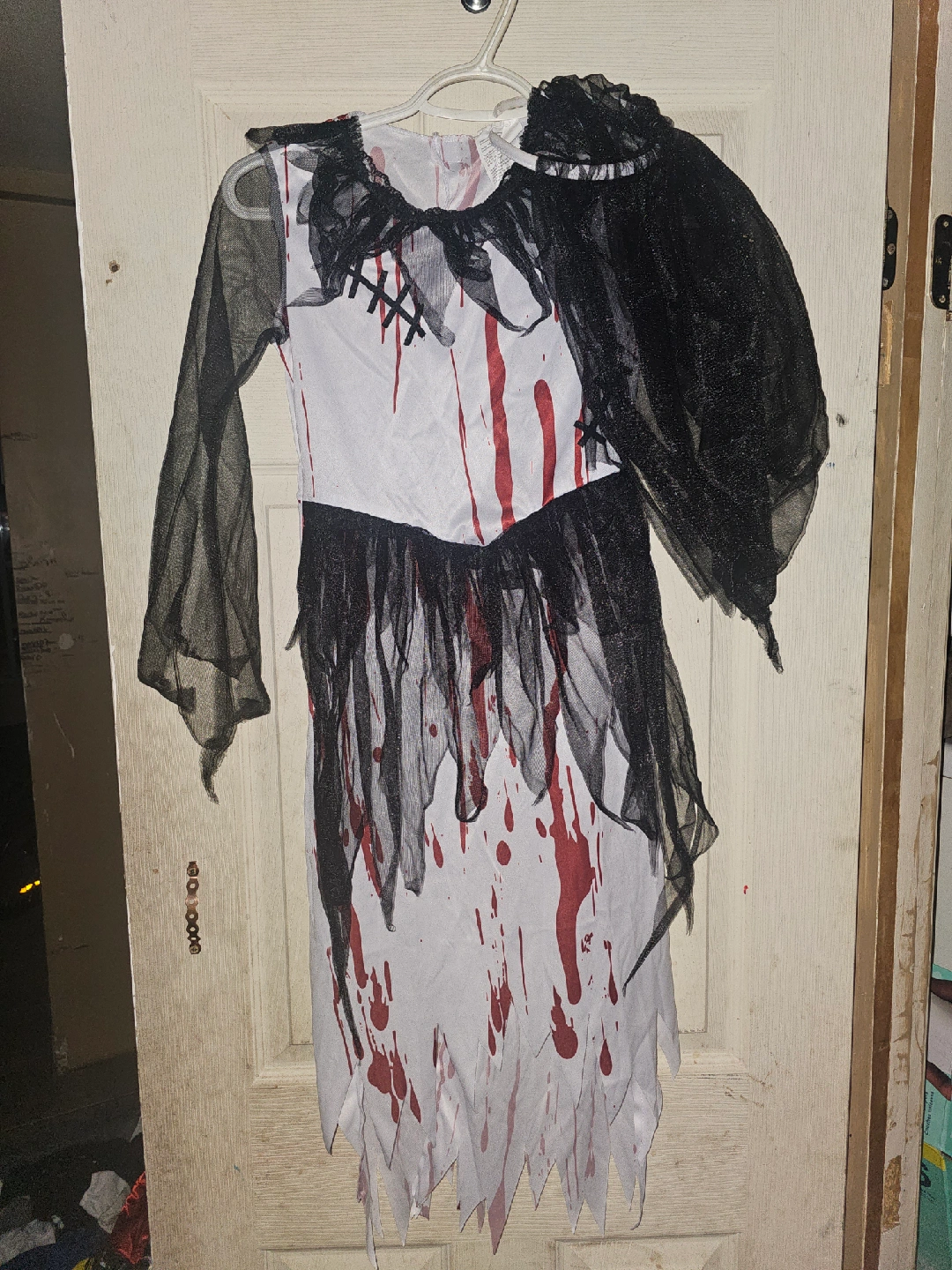 A Halloween costume dress with black and white details and fake blood stains. Perfect for your next Halloween party or event! size 8-10