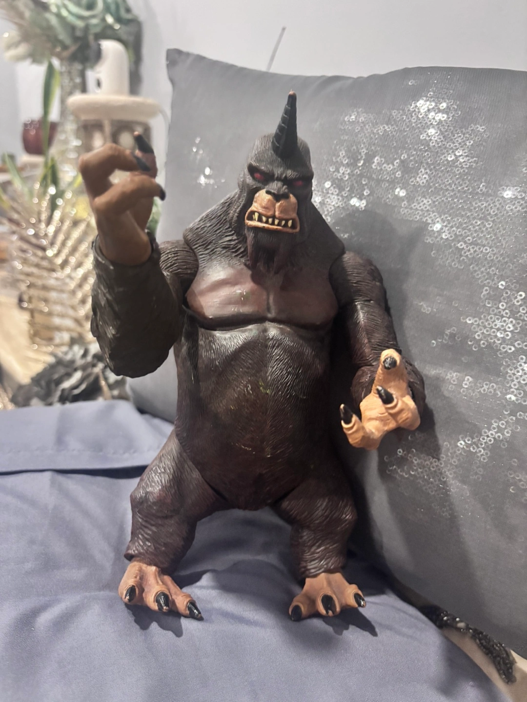 This impressive gorilla monster figure combines the power of a primal beast with the mythical look of a horned creature. A perfect addition for fans of Lanard toys, Kaiju-style monsters, King Kong-style beasts, or vintage action figure collections.