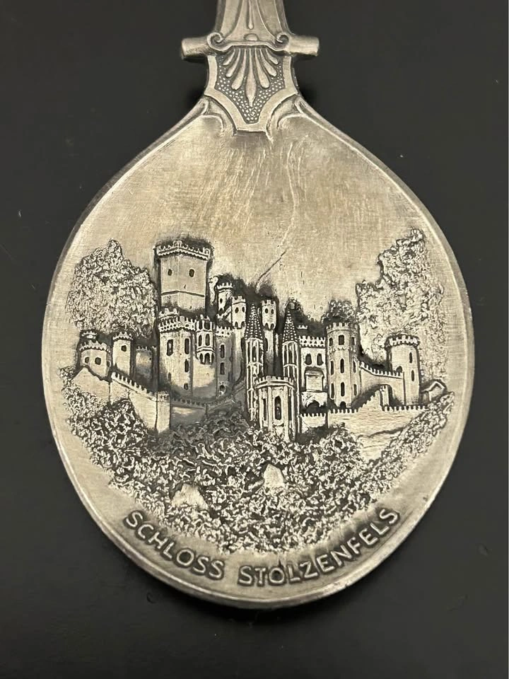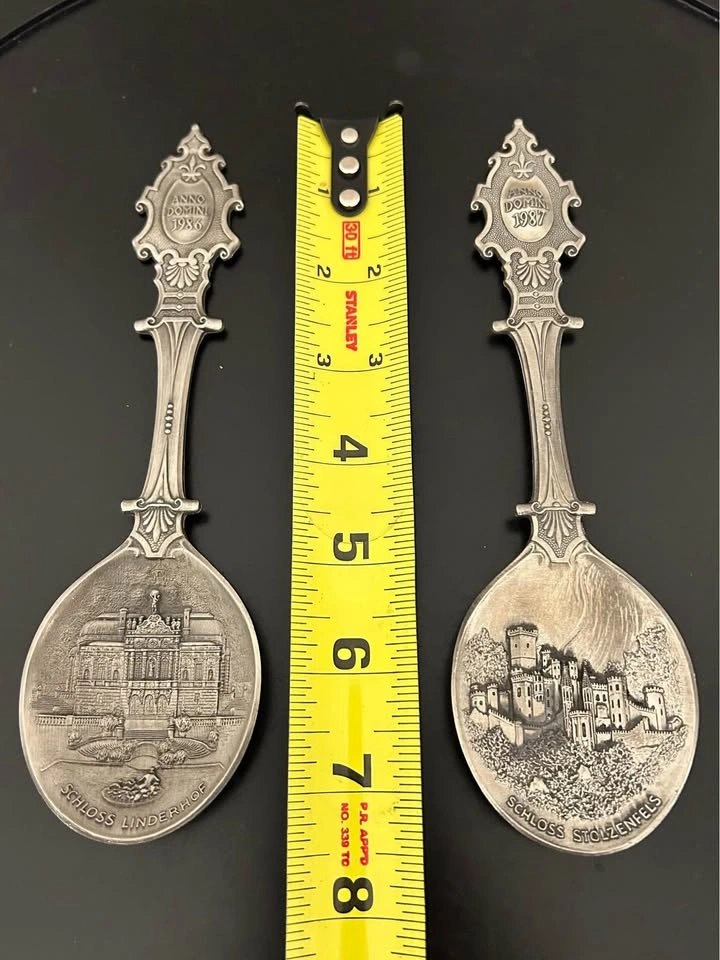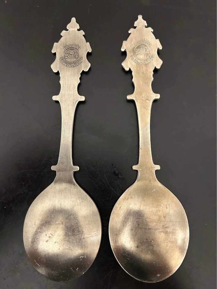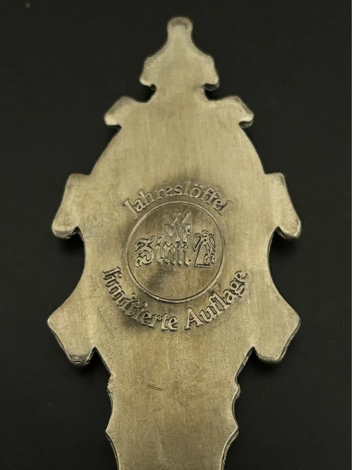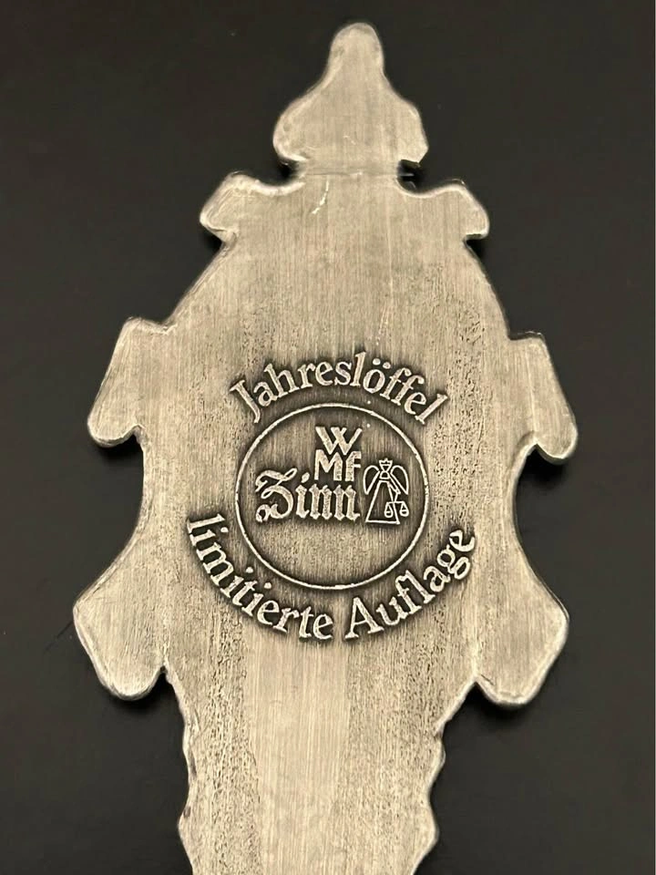 Beautiful pair of vintage German WMF Zinn (pewter) limited-edition collector spoons, featuring detailed reliefs of famous castles: • Schloss Linderhof (1986) • Schloss Stolzenfels (1987) Each spoon is intricately crafted with “Anno Domini” dates on the handle and castle scenes on the bowl. Marked WMF Zinn – limitierte Auflage (limited edition) on the reverse. These collectible annual spoons are part of WMF’s highly regarded “Jahreslöffel” series. • Maker: WMF (Württembergische Metallwarenfabrik) • Material: Pewter (Zinn) • Origin: Germany • Year: 1986, 1987 • Length: ~7” each • Condition: Excellent vintage condition, with light patina consistent with age (see photos) Perfect for collectors of German pewter, castle memorabilia, or WMF annual series. Pick up: Seton area, Calgary. See also my other lots. Open to your questions and suggestions. If necessary, I provide additional photos. These are not new things, so please look carefully at the photos and videos.