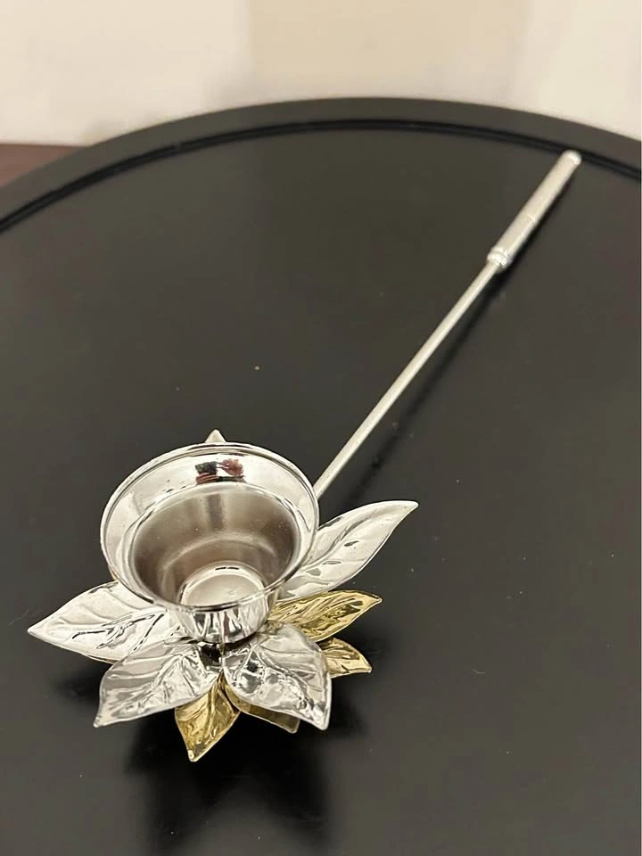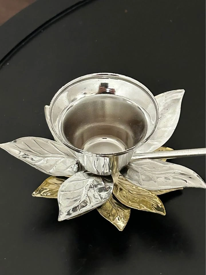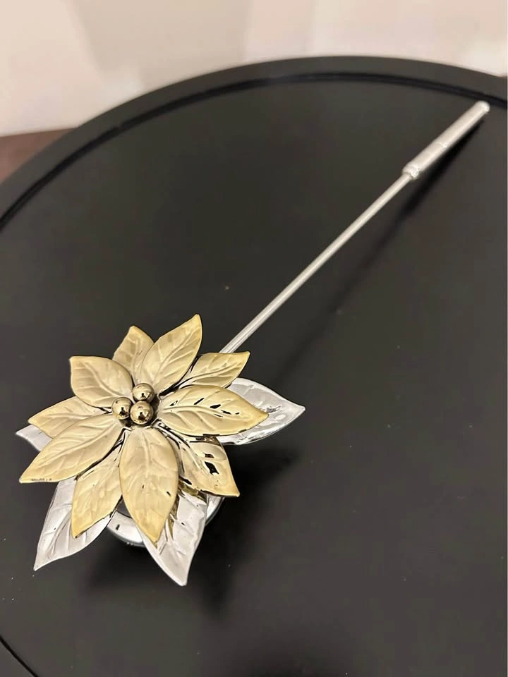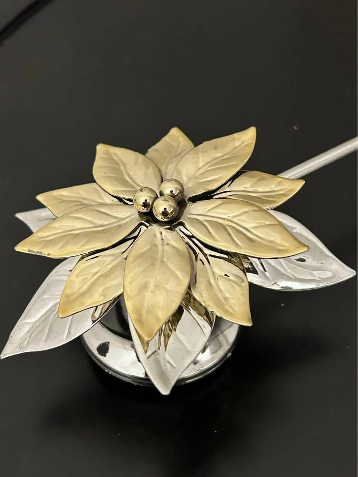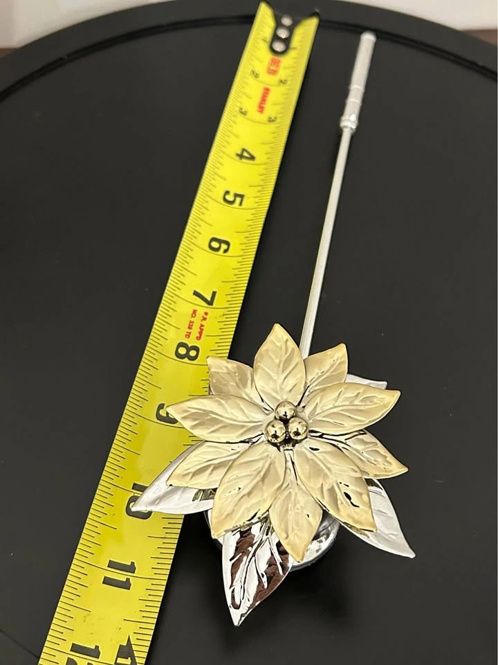 Elegant vintage metal candle snuffer featuring a beautiful poinsettia flower design in silver and brass tones. The long handle allows easy candle extinguishing while adding a festive decorative touch — perfect for the holidays or year-round use. • Material: Silver-tone and brass-tone metal • Design: Poinsettia flower with layered leaves and gold-tone center • Size: Approx. 11” long • Condition: Excellent vintage condition with light surface wear (see photos) • Function: Fully functional and decorative A lovely collectible accent for your Christmas decor or candle collection. Pick up: Seton area, Calgary. See also my other lots. Open to your questions and suggestions. If necessary, I provide additional photos. These are not new things, so please look carefully at the photos and videos.
