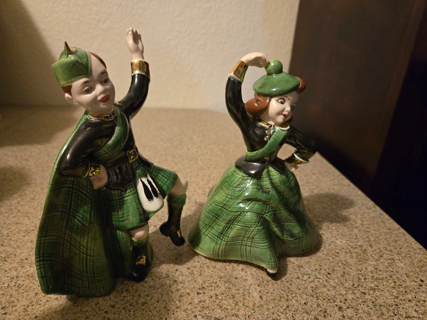 Selling a pair of vintage Scottish dancers figurines. They are dressed in traditional Scottish attire with green plaid patterns. Great for collectors or as a decorative piece!