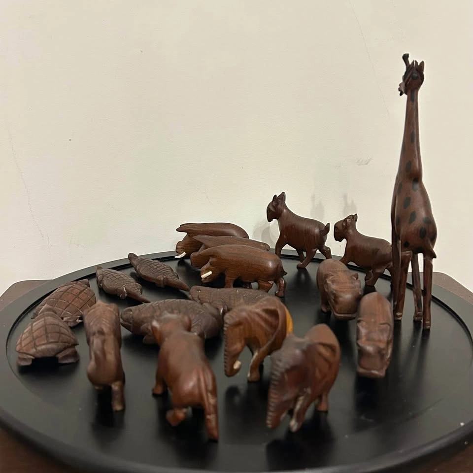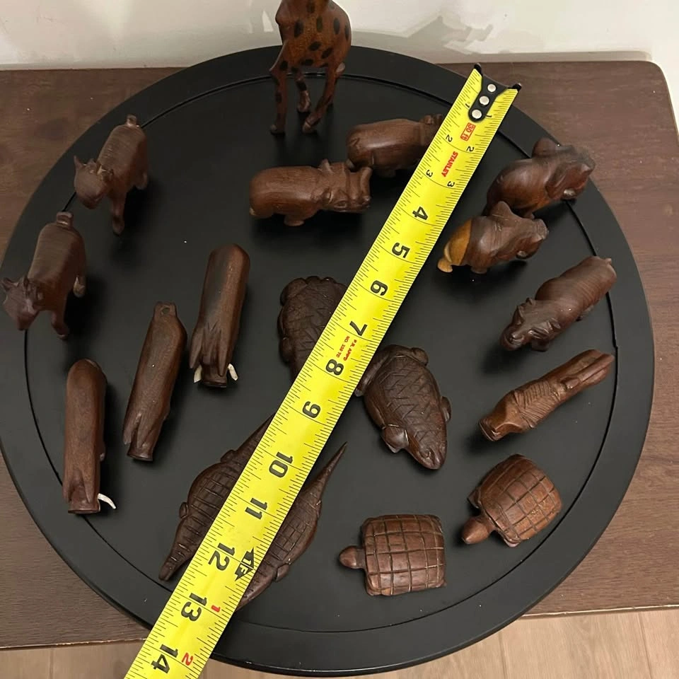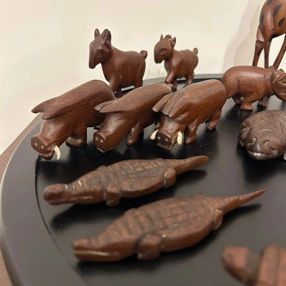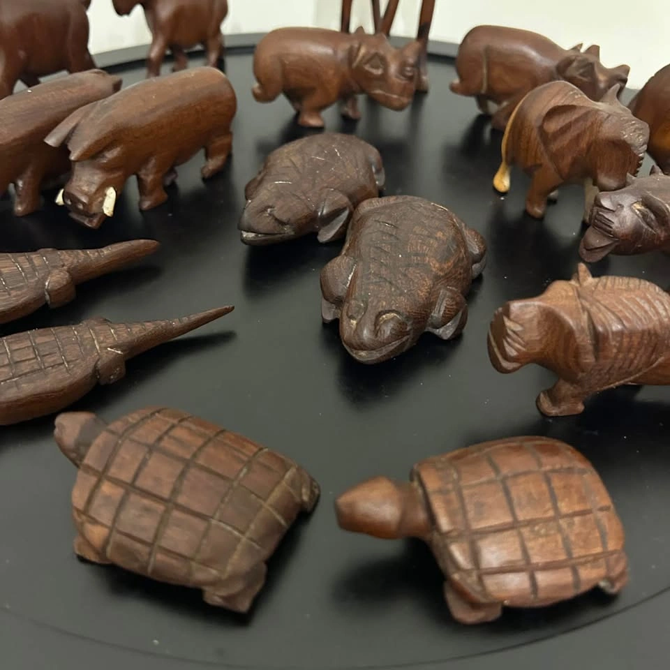 Charming collection of 18 vintage hand-carved wooden animals, likely from East or Central Africa, crafted from dark hardwood with a smooth natural finish. Includes a giraffe, hippos, turtles, crocodiles, elephants, warthogs, and other wildlife figures. Each animal is individually carved, giving every piece its own unique personality and detail. Perfect for rustic, tribal, or safari-style decor. • Material: Hand-carved hardwood • Quantity: 18 figures total • Origin: African artisan work (likely Kenya or Tanzania) • Condition: Overall good vintage condition with minor imperfections (some small chips and missing details, see circled photos) A warm and characterful handmade set — ideal for collectors, display, or gift. Pick up: Seton area, Calgary. See also my other lots. Open to your questions and suggestions. If necessary, I provide additional photos. These are not new things, so please look carefully at the photos and videos.