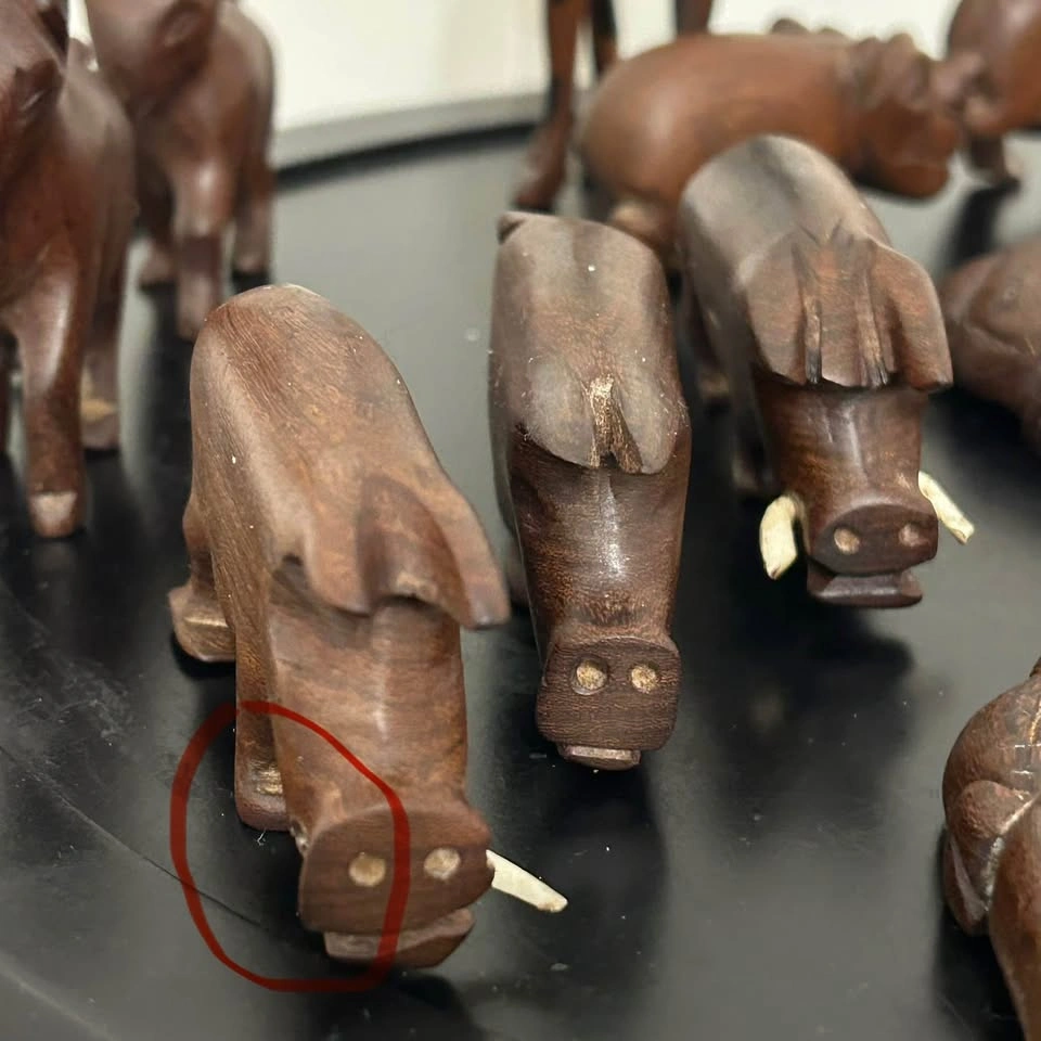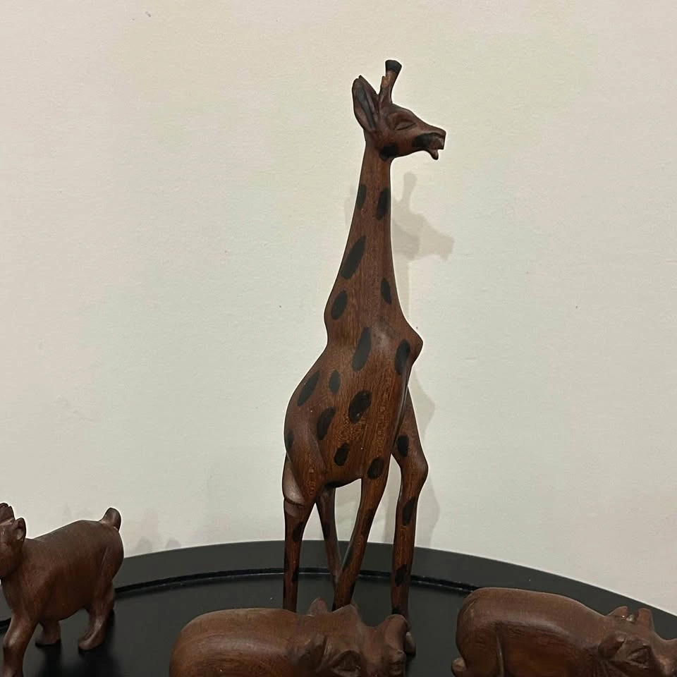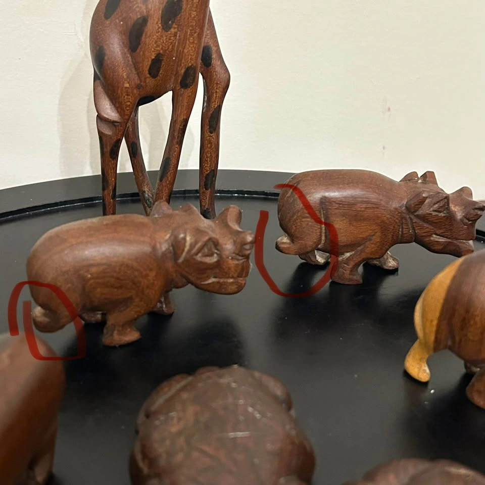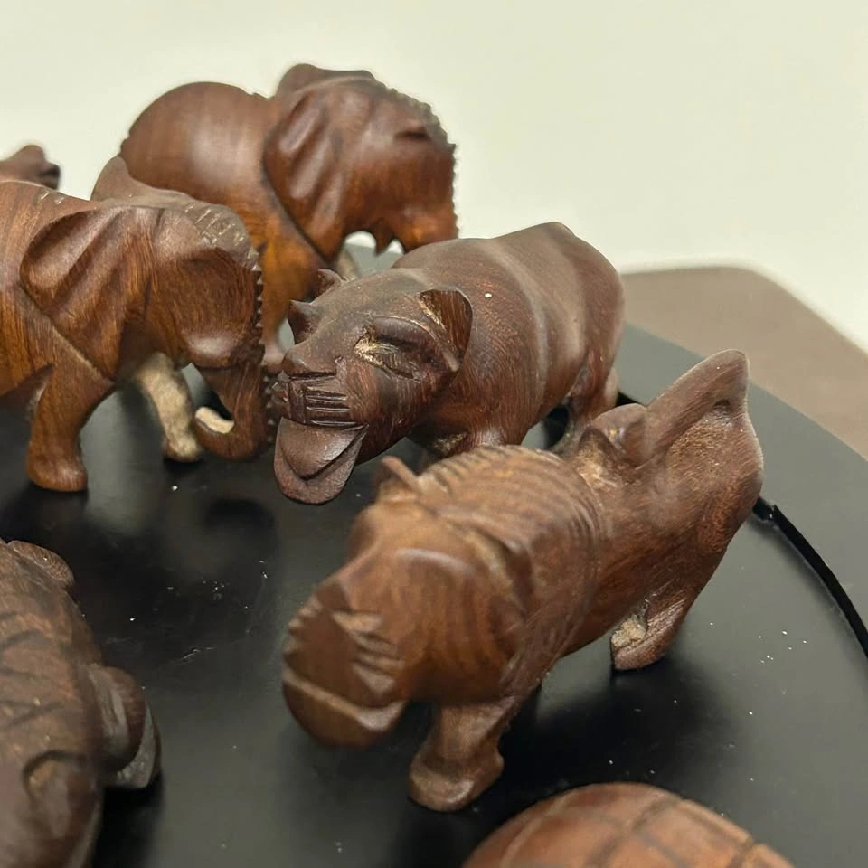 Charming collection of 18 vintage hand-carved wooden animals, likely from East or Central Africa, crafted from dark hardwood with a smooth natural finish. Includes a giraffe, hippos, turtles, crocodiles, elephants, warthogs, and other wildlife figures. Each animal is individually carved, giving every piece its own unique personality and detail. Perfect for rustic, tribal, or safari-style decor. • Material: Hand-carved hardwood • Quantity: 18 figures total • Origin: African artisan work (likely Kenya or Tanzania) • Condition: Overall good vintage condition with minor imperfections (some small chips and missing details, see circled photos) A warm and characterful handmade set — ideal for collectors, display, or gift. Pick up: Seton area, Calgary. See also my other lots. Open to your questions and suggestions. If necessary, I provide additional photos. These are not new things, so please look carefully at the photos and videos.