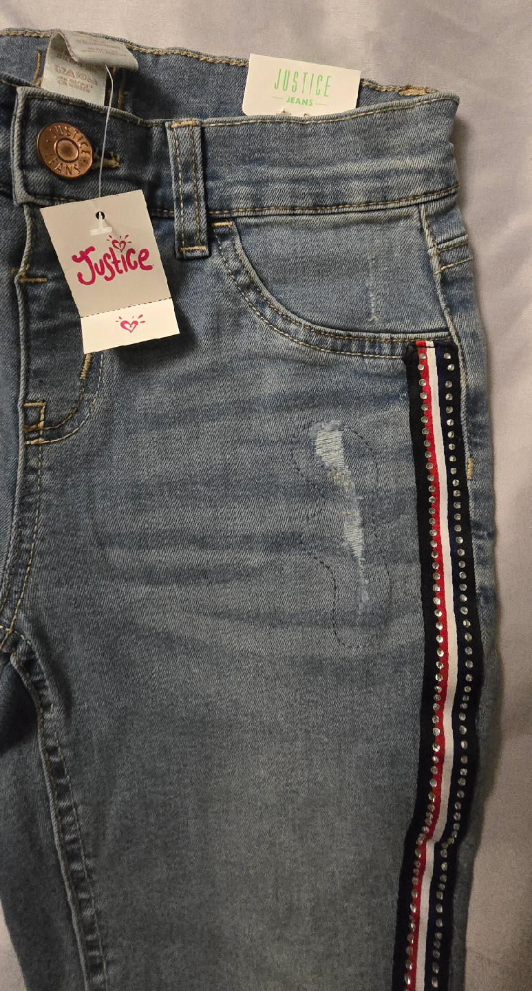 Selling a pair of Justice jeans in size 12! These unique jeans have stylish stripes with sparkly jewel details down the side! Brand new with tags! Also great for gift giving!