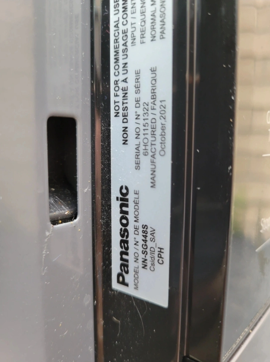 Selling a Panasonic microwave oven, model NN-SG448S. It's in used condition but still works great! It's a 900W high power microwave with auto cook and reheat options. Manufactured in October 2021