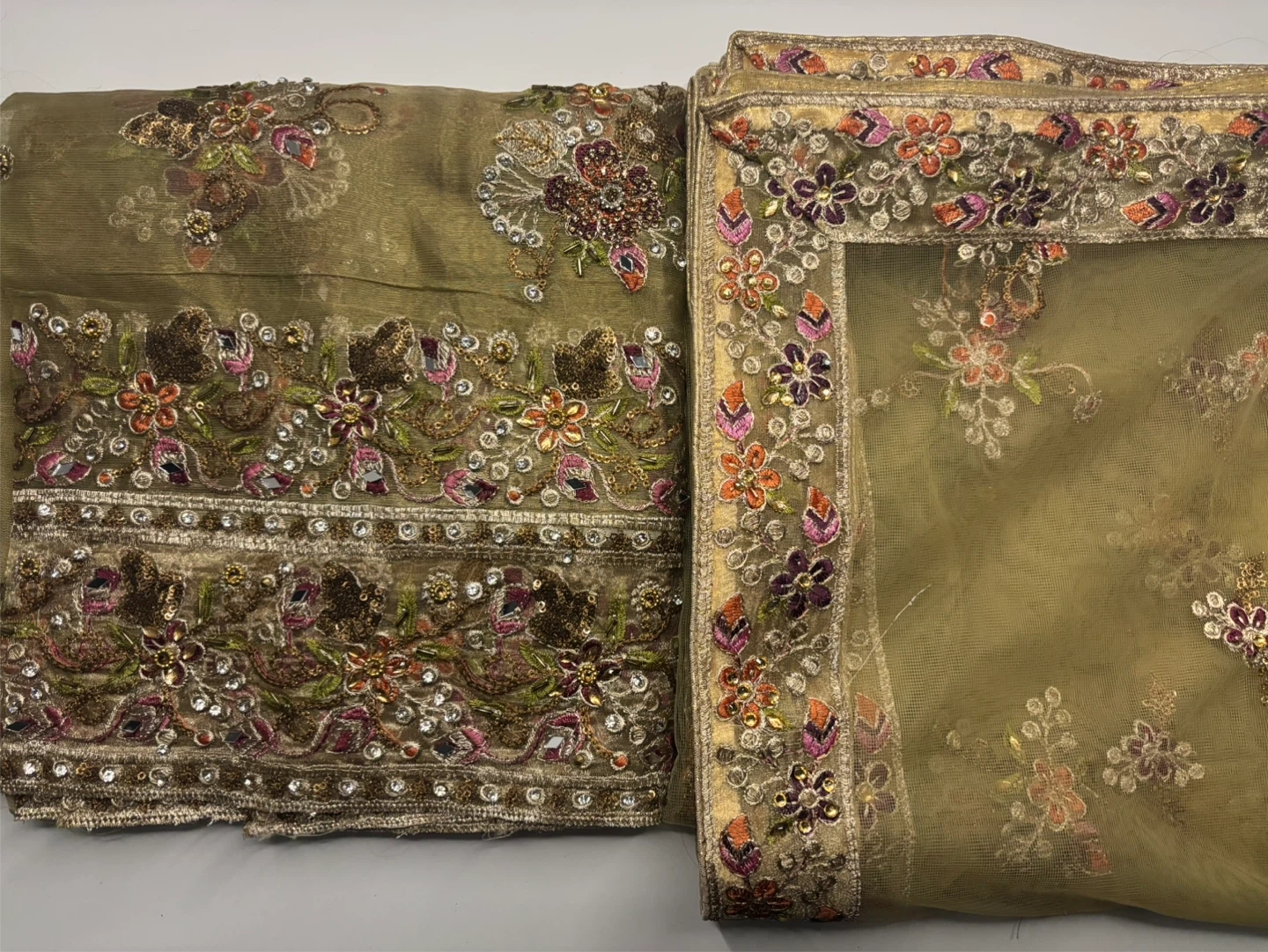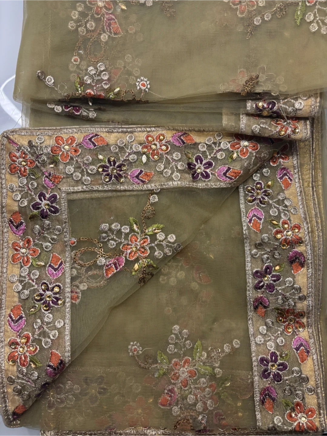 15Beautiful olive green net suit with intricate floral embroidery and beadwork and mirrorwork on front and back! Mehndi colour with golden sheen.