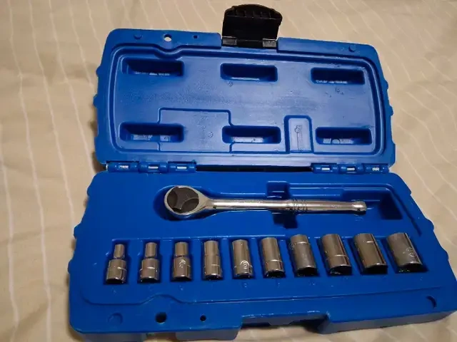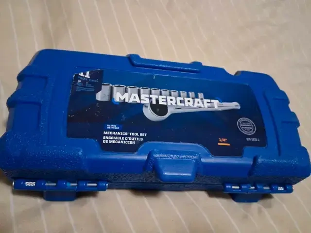 26This Mastercraft Metric Socket Set, containing 11 pieces, is ready for your next project! It includes 10 sockets and 1 ratchet, all neatly arranged in a durable blue case. in good working condition, ready to tackle any task you throw at them. Features: * 10 metric sockets * 1/4" drive ratchet * Durable carrying case