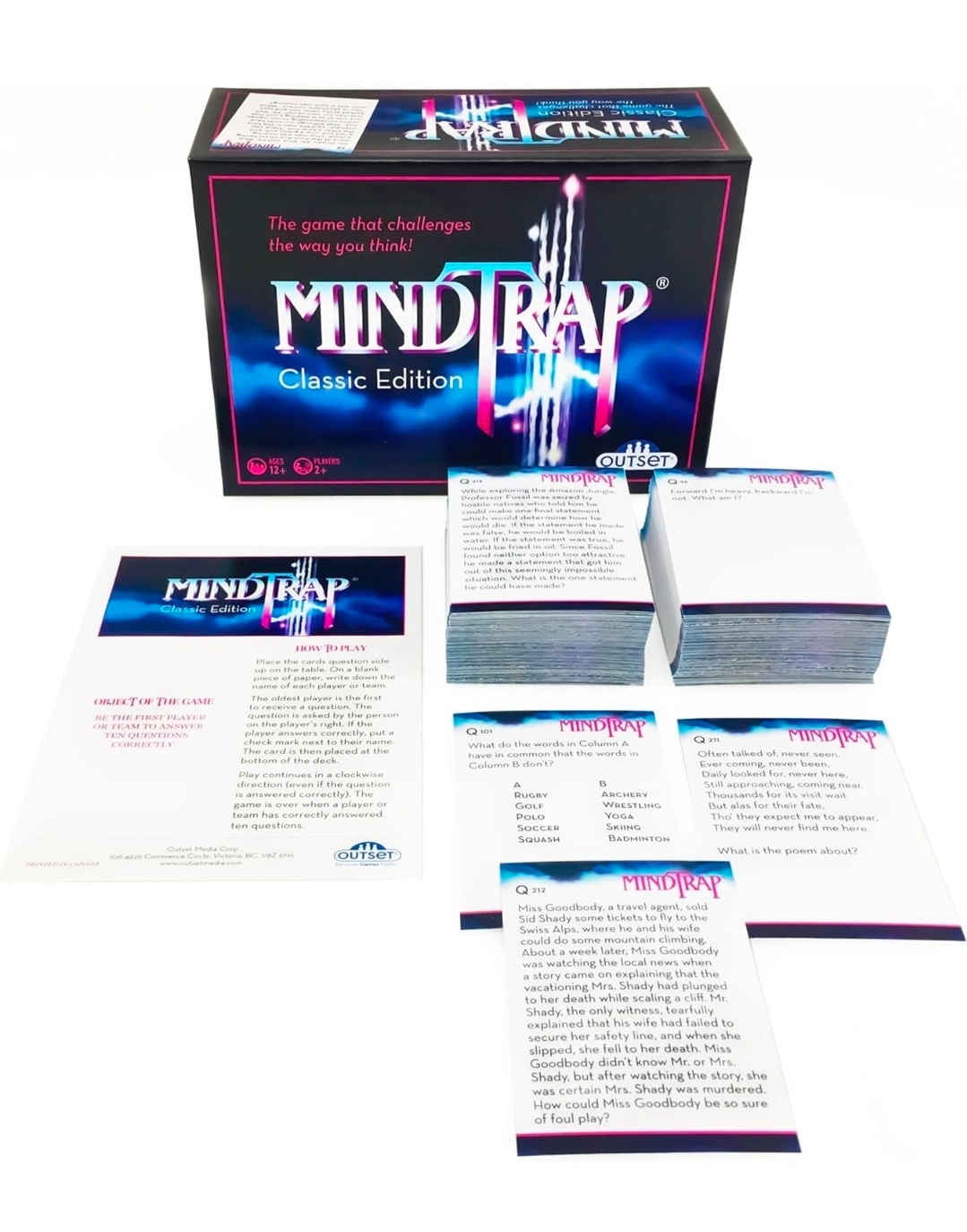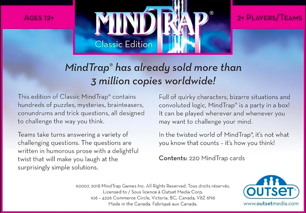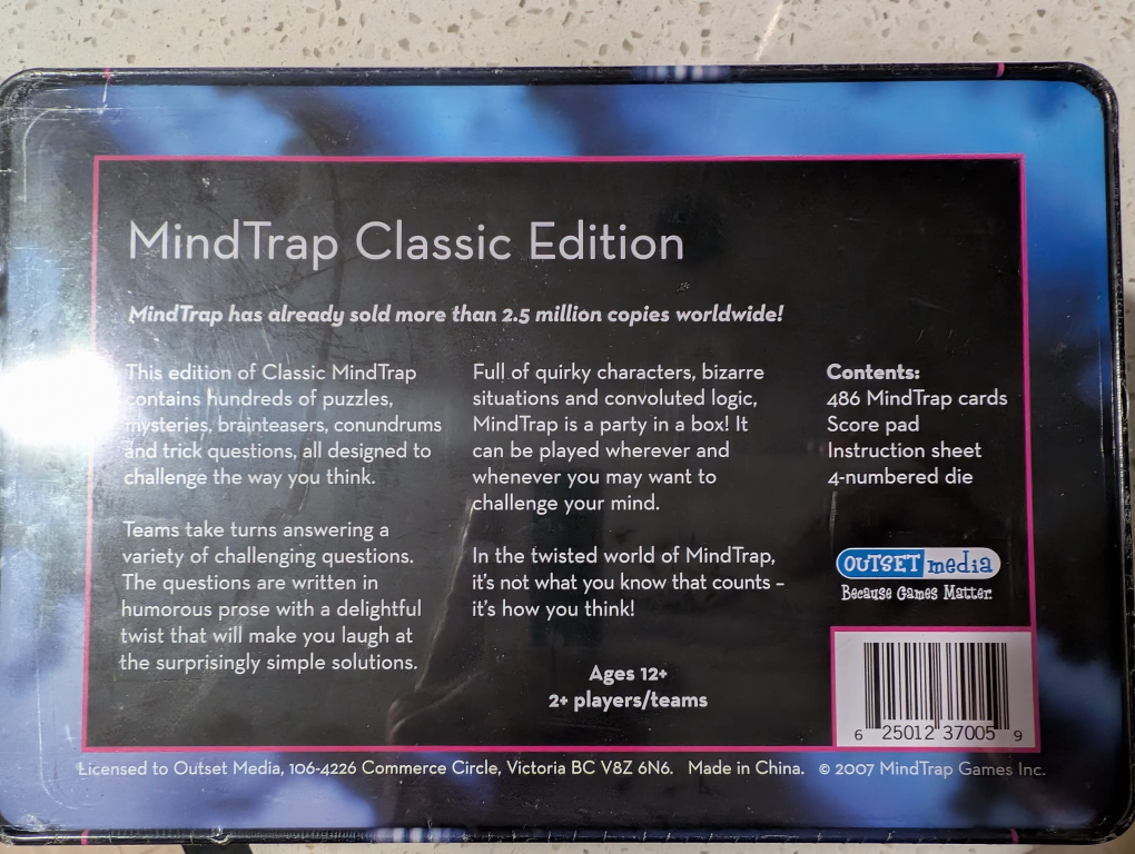 Selling a MindTrap Classic Edition board game! It's a game that challenges the way you think. This edition contains hundreds of puzzles, mysteries, brainteasers, conundrums and trick questions, all designed to challenge the way you think. It's for ages 12+ and for 2+ players/teams. Comes with 486 MindTrap cards, a score pad, an instruction sheet, and a 4-numbered die