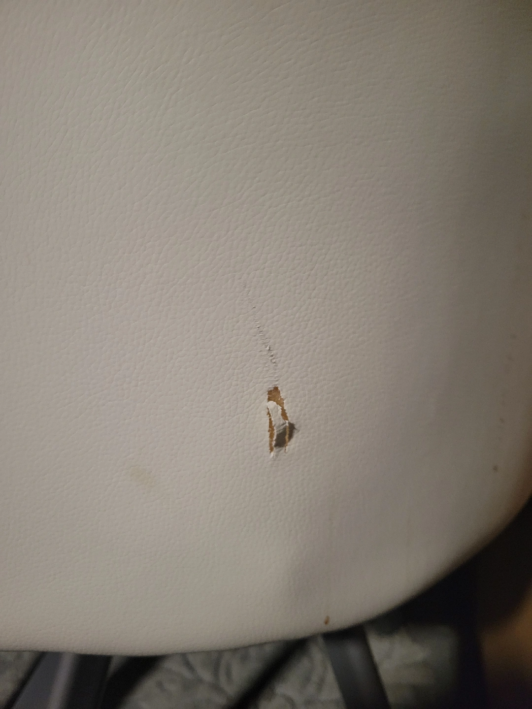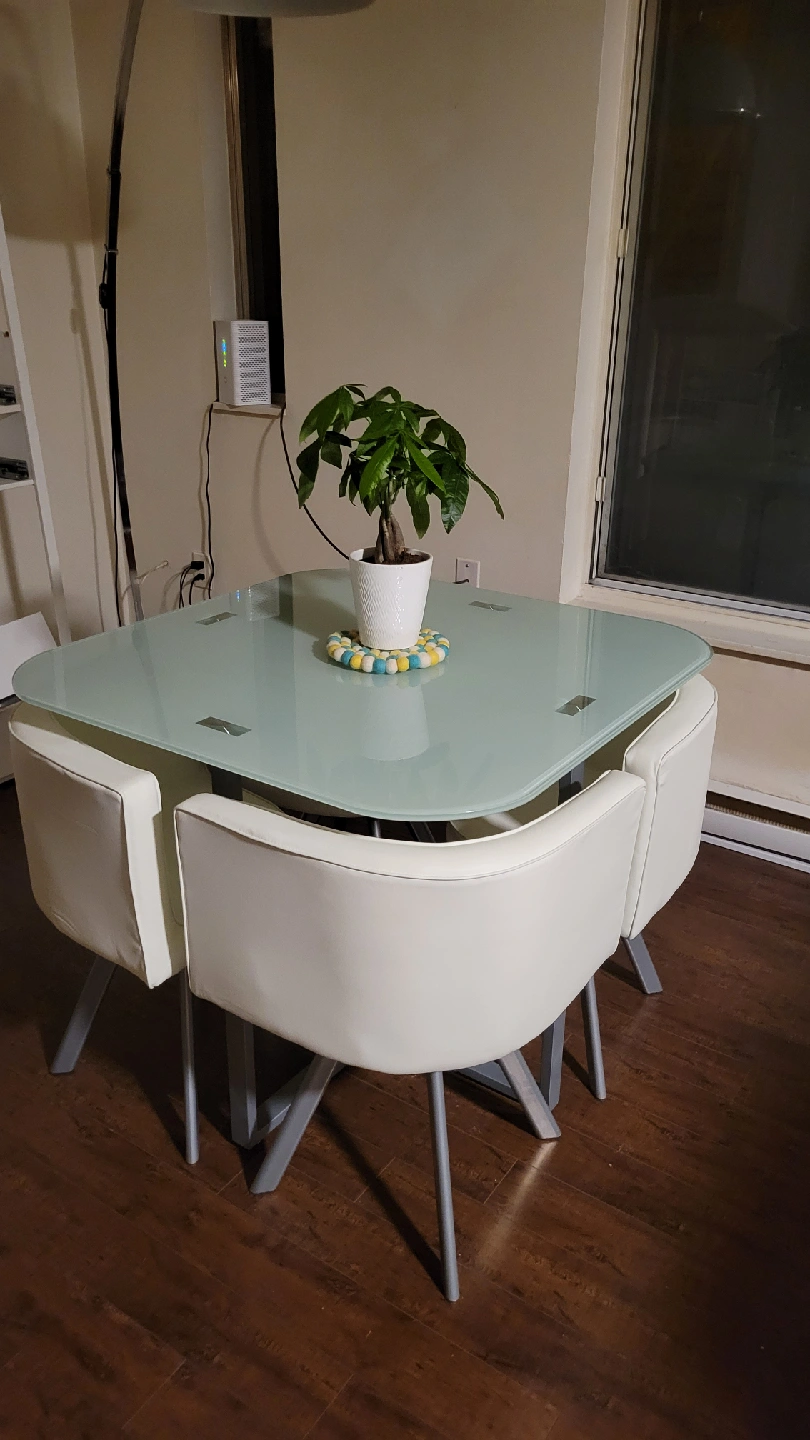 Selling a glass top dining table that comes with four white chairs. There is a small tear on one of the chairs, as shown in the picture. It's a stylish set that would be great for a smaller space.